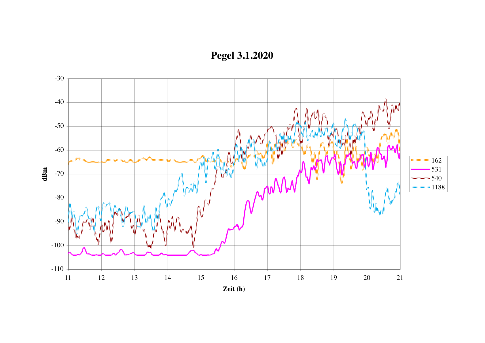hier mal den Signalpegelverlauf ausgewählter Sender vom späten Vormittag bis in den dunklen Abend. Die Sender sind folgende: 162kHz: Allouis, guter Bodenwellenempfang 531kHz: Algerien 540kHz: Ungarn 1188kHz: Ungarn