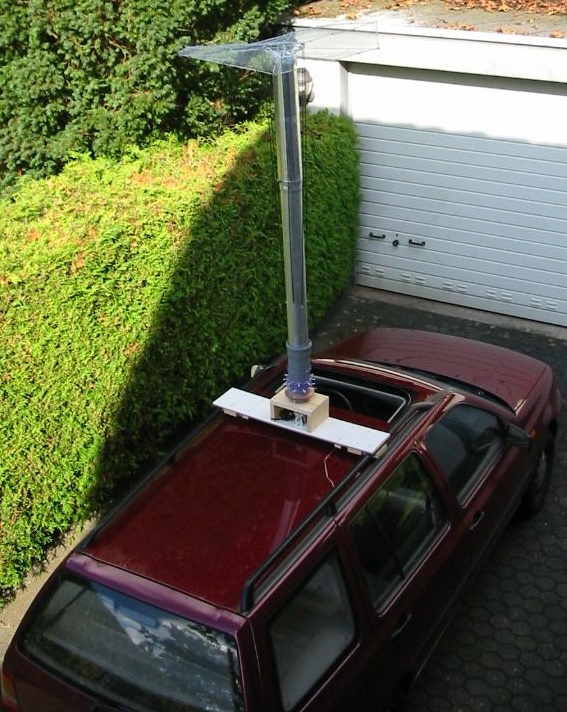 Nachtrag vom 28.10.2020: Seit 2017 stellt HB9ABX seine Dachkapazität in der Neuversion senkrecht, wie auch den Kurzstrahler selbst. Seine "Neuerfindung" der Dachkapazität nennt er Raumkapazität, was aber nichts anderes ist. Die Betrachtung der Verluste ist ziemlich vereinfacht, und so kommen rechnerisch hohe Wirkungsgrade zustande. Da die Käufer der CD eine Verschwiegenheitserklärung unterschreiben müssen, bleibt eine sachlich technische Diskussion aus.