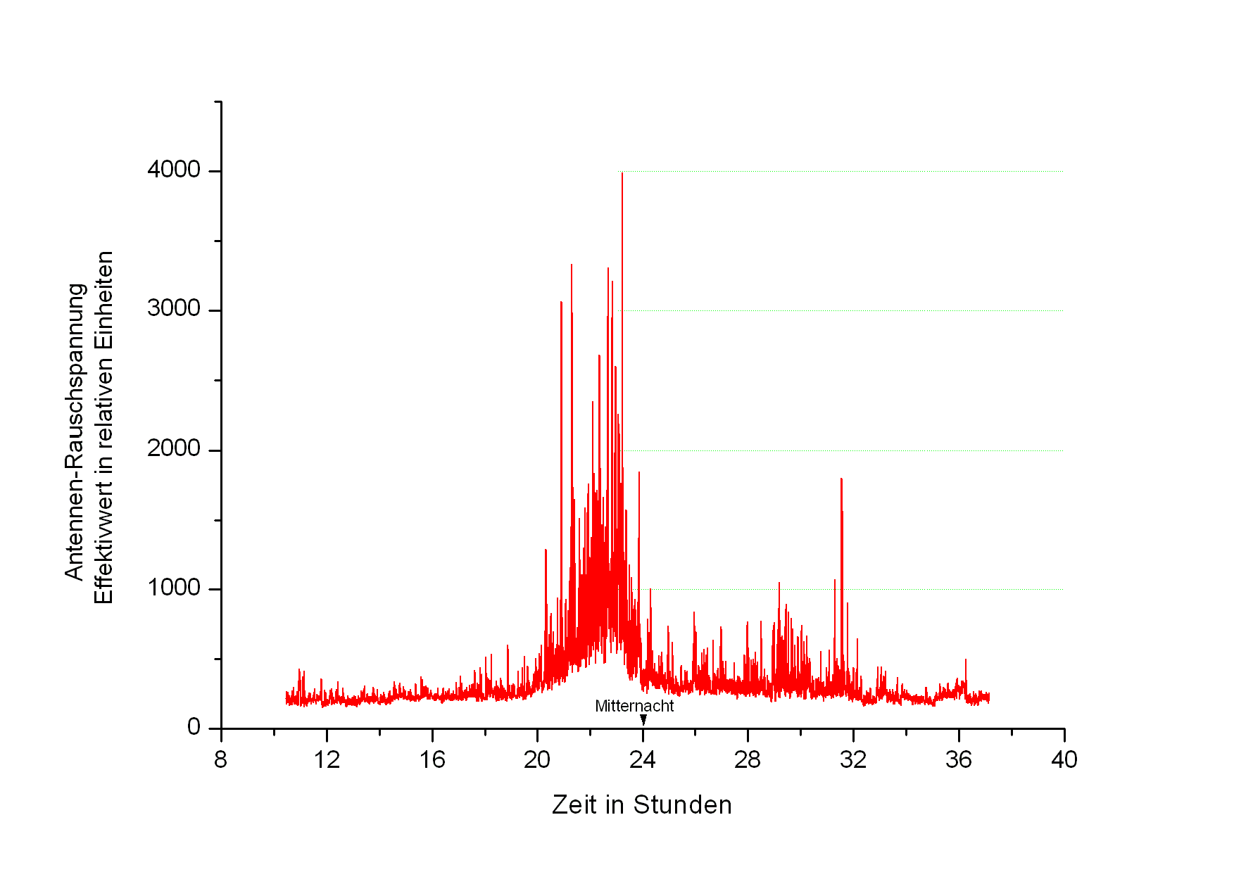 Am Vormittag des Pfingstmontags hatte ich diese Anlage mal wieder angeworfen und sich für 24h selbst überlassen. Die Ergebnisse zeigt die Graphik. Die Antennenspannungswerte sind hier noch nicht kalibriert. Als Anhaltspunkt kann man davon ausgehen, daß der Antennenpegel zu Beginn der Aufzeichnung bei wenigen 10µVeff liegt. Der starke Anstieg fällt zeitlich mit der Gewitterfront in NRW in dieser Nacht zusammen. Ich nehme deshalb an, daß er auch davon verursacht ist. Die Entfernung zwischen meinem Standort und NRW liegt bei ca. 600km.