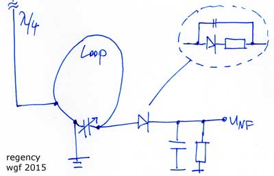 Es handelt sich um die einfachste Detektorschaltung für UKW mit Flankengleichrichtung. Loop parallel zum Drehko. Diode direkt auf 470 pF gegen Masse, keine Anzapfung, keine zusätzliche Antenne, nur der Magnetanteil der Sende-HF wird genutzt. Der NF Verstärker muss empfindlich sein (einige Millivolt) und braucht rund 50 kOhm Eingangsimpedanz, je höher desto besser. Mit einem Alu-Lambda-Viertel Stab (75 cm), den man in die Nähe des kalten Endes bringt, oder einem Kupfer-Messkabel gleicher Länge, dass nahe ans kalte Ende geklemmt wird, kann man sehr einfach etwas mehr Lautstärke herausholen. Immer auf Kosten der Selektion.