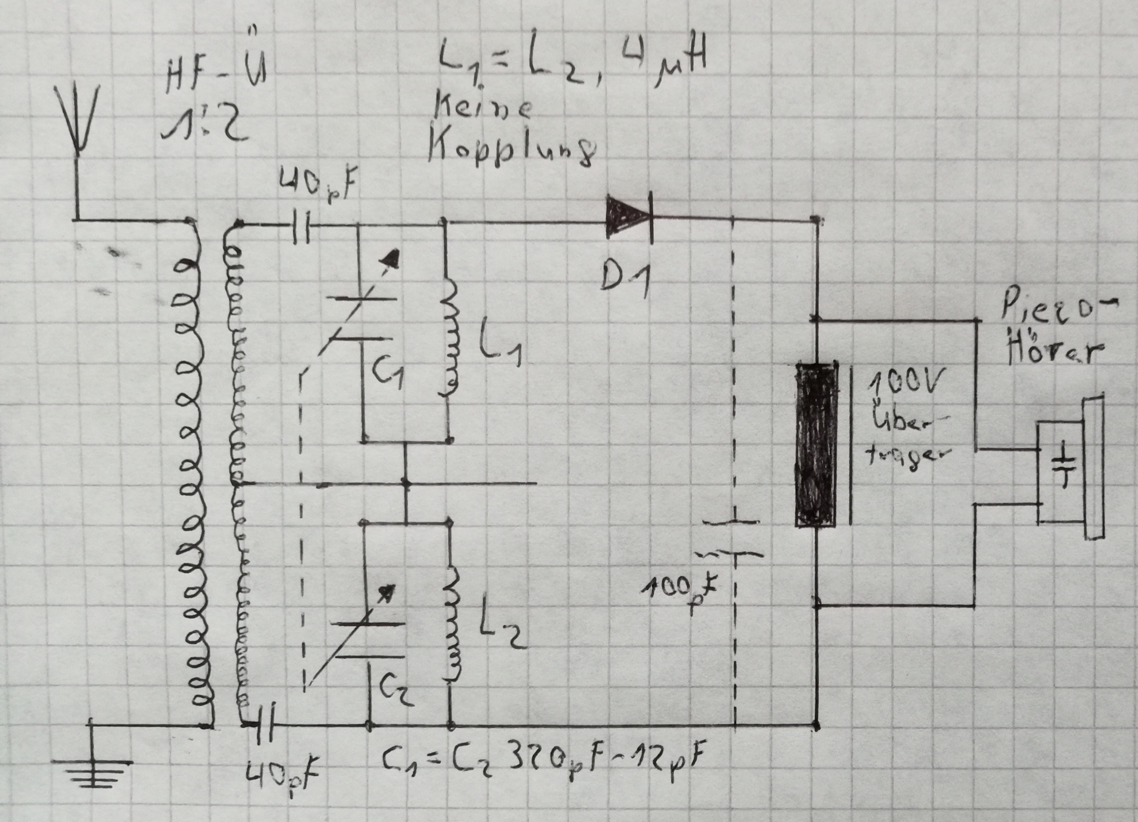 Die Spulen der zwei Schwingkreise, L1 und L2, dürfen meiner Meinung nach keine Kopplung aufweisen. Die beiden Schwingkreise könnten vollkommen unabhängig sein. Zur galvanische Trennung der Schwingkreise dienen auch die beiden 40pF Kondensatoren. Jetzt kommt evtl. meine Fehl-Denke. Ist die HF-Welle im Moment im oberen Teil positiv, ist das untere Ende des HF Übertrager negativ. Auf der Mittelanzapfung wäre dann "0 Volt". Der Übertrager dient hier sozusagen als Symmetrie-Wandler. Somit schwingt der untere Schwingkreis gegensätzlich zum oberen Schwingkreis, was sich an den beiden Enden der Kreise als "doppelte" HF darstellt? Der Feinschliff, z. B. parallel geschaltet Trimmer-Ko, sind hier noch nicht drin. Die nachfolgende Detektion sind dann "Routine".