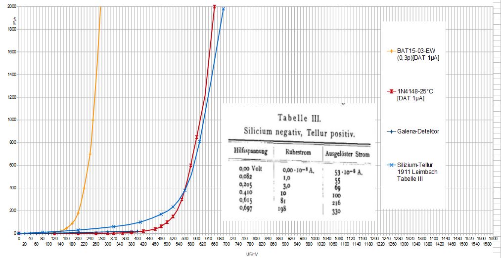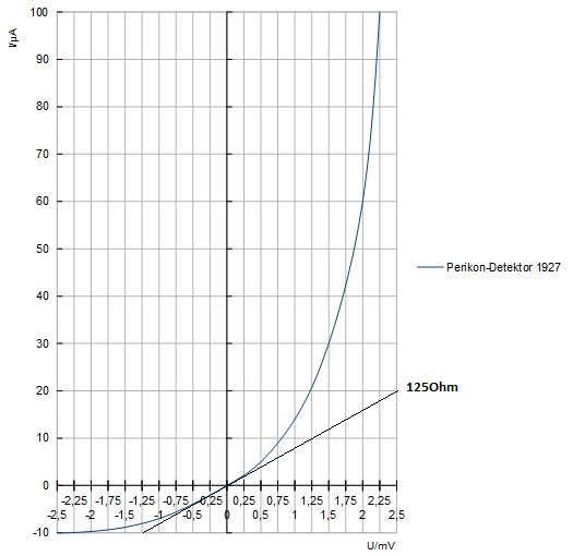 Noch ein Vergleich: Im Lehrbuch "Banneitz: Lehrbuch der drahtlosen Telegraphie und Telephonie",(1927) ist u.a. die Kennlinie Eines Perikon-Detektors abgebildet. Als sehr empfindlich beschrieben, die Kennlinie wird schon im mV-Bereich schön krumm. Allerdings eine sehr niederohmige Geschichte, wenn man sich wieder den Innenwiderstand des Detektors anschaut.