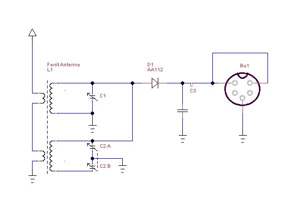 heute habe ich mir mal Zeit für Basteleien gegönnt. Auf meinem Steckbord habe ich mir dann mal ein paar Detektorschaltungen aufgebaut. Über den Empfang mit einer dieser Schaltungen habe ich mich dann doch gewundert. Hiermit kann ich 10 MW-Sender empfangen. Die Trnnschärfe ist sehr gut (finde ich jedenfalls). Was mich mal interessieren würde, wie viele Sender empfängt man normalerweise mit einem Detektorempfänger, mit einem 500pF Drehko und ohne Spulenwechsel? Zu meinem Aufbau, ich habe für die zwei Spulenpaare eine Ferritantenne verwendet. Als Antenne dient meine 20m Langdrahtantenne. Für den Abgleich habe ich C1 auf maximale Empfindlichkeit eingestellt und C2 dient dann zur Sendereinstellung.