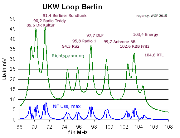 Die blaue Kurve zeigt jeweils die Spannungsdifferenz, die sich auf der Kurve bei +/- 75 kHz ergibt. Die Maxima stellen somit den besten Empfang bei größter Dynamik dar, als NF Spannung Spitze-Spitze auf der Flanke.