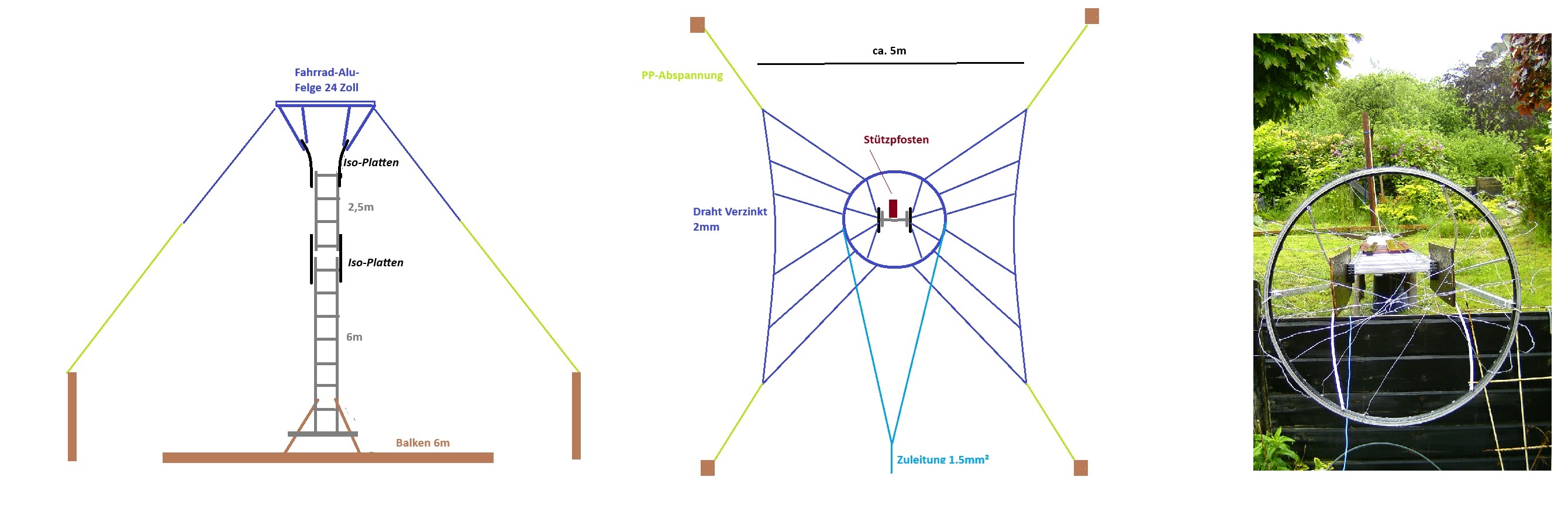 Die 6m-Leiter ist jetzt isoliert mit einem weiteren Alu-Leiterstück verlängert, eine leichte Alu-Felge sorgt für stabile Aufhängungspunkte der Abspanndrähte, die mit 2mm-Zaunspanndraht zur kleinen Schirmantenne erweitert sind. Zunächst sind die Abspannseile gegen den Masfuss gespannt, so dass die Drahtnetze beim Aufrichten des Mastes nicht wild herumflattern können.