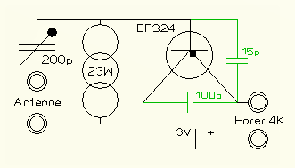 vorab möchte ich mich für die Infos bedanken. Dein Hinweis HB9, insbesondere die einzubringende Kapazität zwischen Basis und Emitter trägt entscheidend zum Einbringen der Enddämpfung (Rückkopplung) des Schwingkreises bei. Mit dem Kondensator vom Emitter nach Masse in Abstufungen von 56pF bis 180pf hatte ich mich vorab schon versucht. Da im Hörtest kein wesentlicher Unterschied erkennbar war, hatte ich ihn wieder entfernt. Es ist jetzt eine weitere Zunahme der Empfindlichkeit hörbar. Eine Feinregelung der Rückkopplung wäre noch einzufügen, um diese dem empfangenen Signal anzupassen. Das werde ich mit Regelung der Betriebsspannung versuchen.