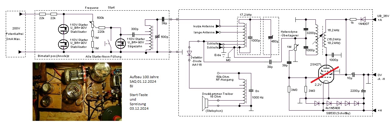 Hallo, Zum 100 Jährigen hat der Detektor einen externen Kippgenerator bekommen, herausgeflogen ist die NF-Verstärkung, da jetzt ein 2-stufiger NF-Verstärker vorhanden ist. Es waren einige Versuche notwendig: Der Stabilisator STV 100/25Z beispielsweise war bei kleinen Vorwiderständen nicht mehr sicher in der Kipplstufe zum Schwingen zu bringen. 110V-Leuchtstoffröhren-Starter mit Argon (?)-Füllung verursachten wilde Schwingungen.