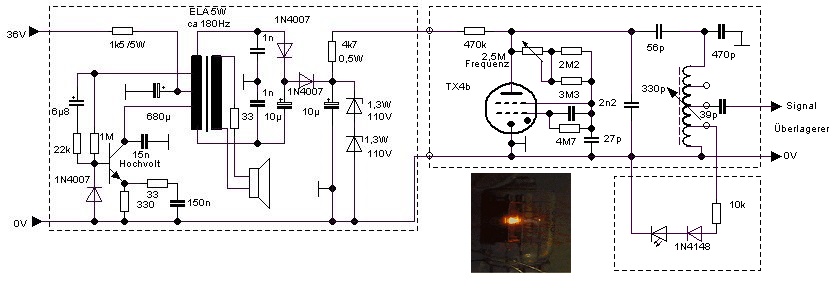 Für den Fall ist das Detektor-Projekt nochmal überarbeitet worden: - Vereinfachung des Detektors, kein Drehko mehr, nur noch Permeabilitätsabstimmung. - Bau eines 200V-Netzteiles für den Überlagerer -Subminiatur-Kaltkathoden-Kleinthyratron (TX4b) anstelle der Glimmlampe -Resonanztrafo für gleichmäßige Überlagerer-Spannung.