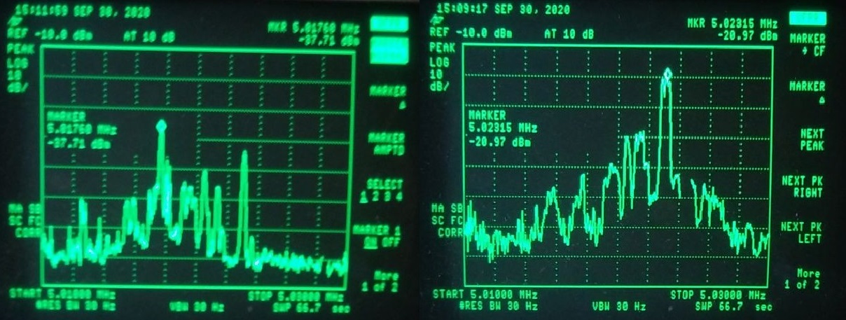 In meinem Spektrum vom 30.09.20/15:07:19 kann man den HWU mit gleichem Pegel wie DHO38 sehen. Ich habe mich schon über die Breite des Signals gewundert gehabt. Des Rätsels Lösung sind die beiden Resonanzfrequenzen, die zusammen mit der Antennen-Dachkapazität 423 pF (2x18,5m, Feeder 10m) auf 21473 Hz und 16697 Hz Resonanz ergeben, die näher an HWU als an DHO38 liegt. Wahrscheinlich könnte ich noch ein paar dB`s herausholen, wenn ich noch 10 Windungen abwickeln würde. (Nachtrag:waren 50 Windungen)