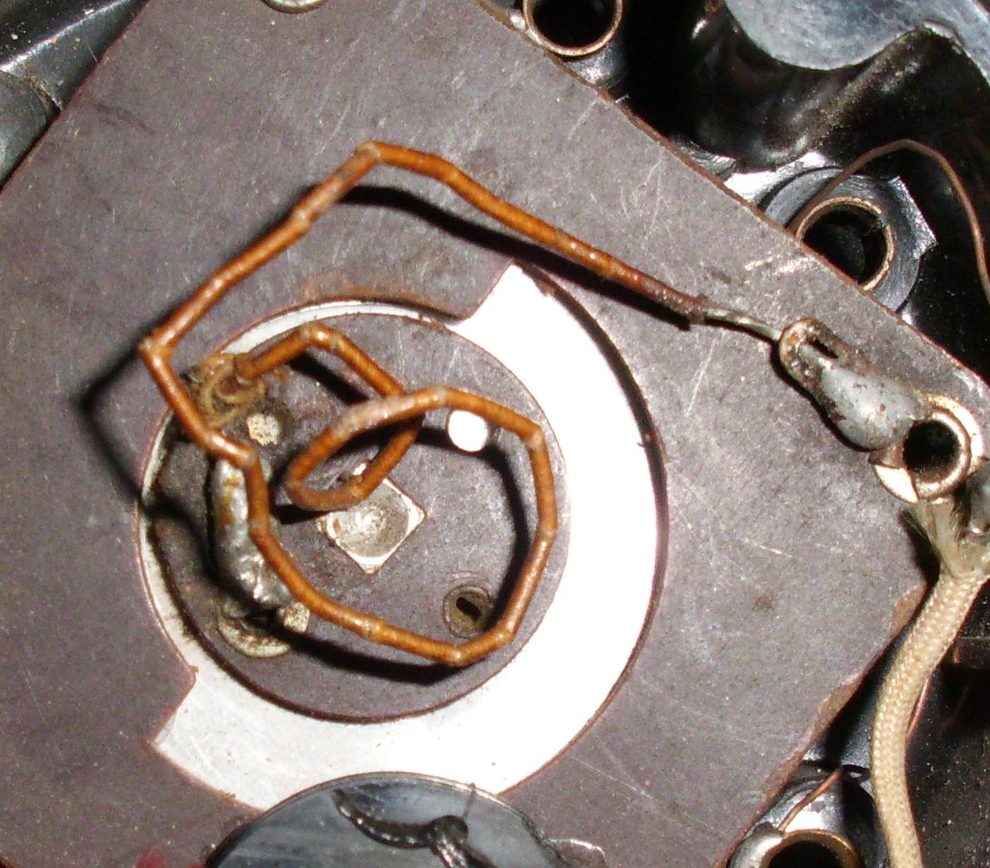 an dem Rotor des Drehkos war ursprünglich ein seiden- bzw baumwollumsponnener hochflexibler Draht, dessen Umhüllung so aussieht, wie der Rote Draht. Alte Umsponnene Telefonkabel sind als Ersatz ganz brauchbar.