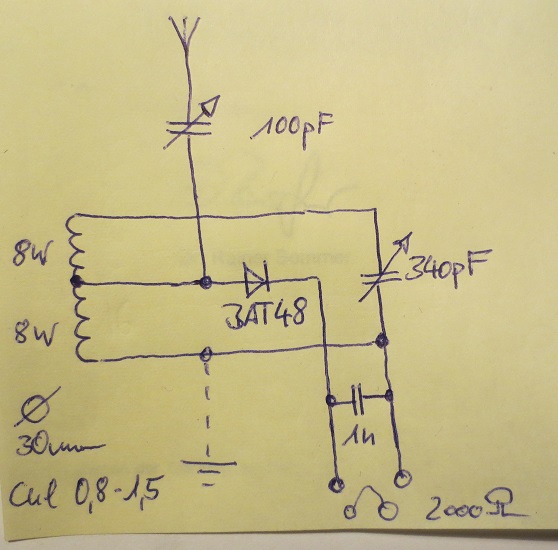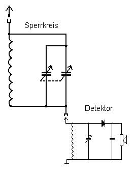 Ja Alfred, dass kann man natürlich auch machen. Rainers Langwellendetektor wäre hier eine gute Vorlage. http://www.welt-der-alten-radios.de/dete...2kreis-196.html Allerdings würde ich die Spulen dann für MW horizontal induktiv koppeln. ( Bei Zylinderspulen) . Die Dioden im Bauvorschlag Nr. 3 sind extrem hochohmig. Deswegen die Parallelanordnung ohne Anzapfung und mit Trafo. Das liegt am sehr hohen Resonanzwiderstand des LW- Schwingkreises. Der erste Detektor, der dann den Antennenkreis bildet, sollte eine trennbare Diodenstrecke haben, wenn ein Kristallhörer verwendet wird. Du hast so immer den Widerstand über die Diode am Schwingkreis. Diese Belastung ist aber eigenlich nicht gewollt. (Deine Skizze).