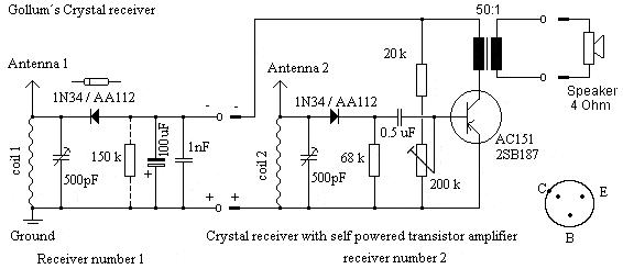 Ich werde auch mal die Variante mit dem Transistor probieren. Mein Eigenbaudetektor im Gehäuse eines ehemaligen Kleinnetzteils funktioniert im Keller mit einer 1 Meter und 3-Meter-Antenne. Ich habe noch einen Umschalter eingesetzt, der wahlweise die Umschaltung auf eine Spule des Mittelwellenbereiches und des Kurzwellenbereiches ermöglicht. Die Kurzwellenspule stammt aus einem 10.7 MHZ- Bandfilter. Zur Abstimmung dient ein Foliendoppeldrehko aius einem alten Kofferradio. Mit der Kurzwellenspule kann ich bei Dämmerungseintritt 3-4 Sender empfangen. In der Antennzuleitung habe ich noch einen weiteren kleinen Foliendrehko als Antenneanpassung geschaltet. Das wirkt sich neben der MW besonders beim Kurzwellenempfang als optimale Anpassung aus. Zum Transistoreinsatz möchte ich Germaniumtypen empfehlen, die eine relativ hohe Stromverstärkung (Beta) besitzen und in ihrer Grenzfrequenz locker mit 2 MHZ klarkommen. Darüberhinaus sollten es Typen sein, die auch bei relativ kleinen C/E-Spannungen funktionieren. Das ist allgemein bei den Ge-NF-Typen eben nicht immerder Fall. Wenn ein Tansistor in der Schaltung nicht funktioniert, dann ist er mölglicherweise defekt oderer hat als HF-Verstärker Probleme mit zu niedriger Grenzfrquenz. Da lassen sich viele andere Ge-Typen, als die in den vorliegenden Beispielen gut verwenden. Ich denke mal pauschal, daß sich da ein geeigneter GE-HF-Typ am besten eignet. Brauchbare Ge-HF-Typen sind z.B.: AF117, AF116, AF125, AF 126, GF 105, GF120, GF121, GF122, GF131, GF132. Russische Typen: P402, P422, P423, GT 309. GT313, GT422 und entsprechende japanische Typen der 2Bxxx -Serie lt. Tabellen. Als NF-Verstärker ist dann die möglichst hohe Stromverstärkung nützlich. Hier sollte man mehrere Exemplare auf beste Funktion testen.