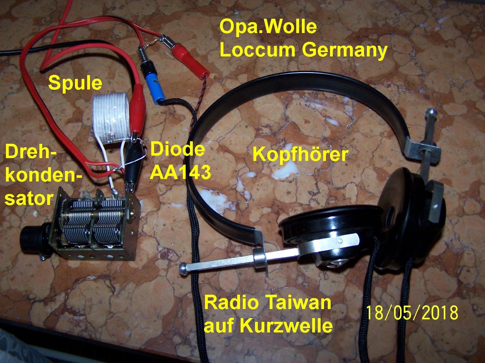 Detektoren, damit haben ja viele von uns angefangen. Ich habe nach langen Jahren auch wieder einen gebastelt, und zwar für die Kurzwelle. Bei Jogi fand ich von Siegfried Neumann einen Bauvorschlag, den habe ich umgesetzt. Eine selbstgewickelte Spule, eine Germaniumdiode AA143, ein ca.320pF Drehko und eine 22Meter Langdrahtantenne. Mein alter Kopfhörer brachte keinen guten Erfolg, als habe ich eine kleinen Verstärker angeklemmt. Der Empfang war beeindruckend, RTI, KBS und CRI waren gut zu hören. hier ein paar Bilder: