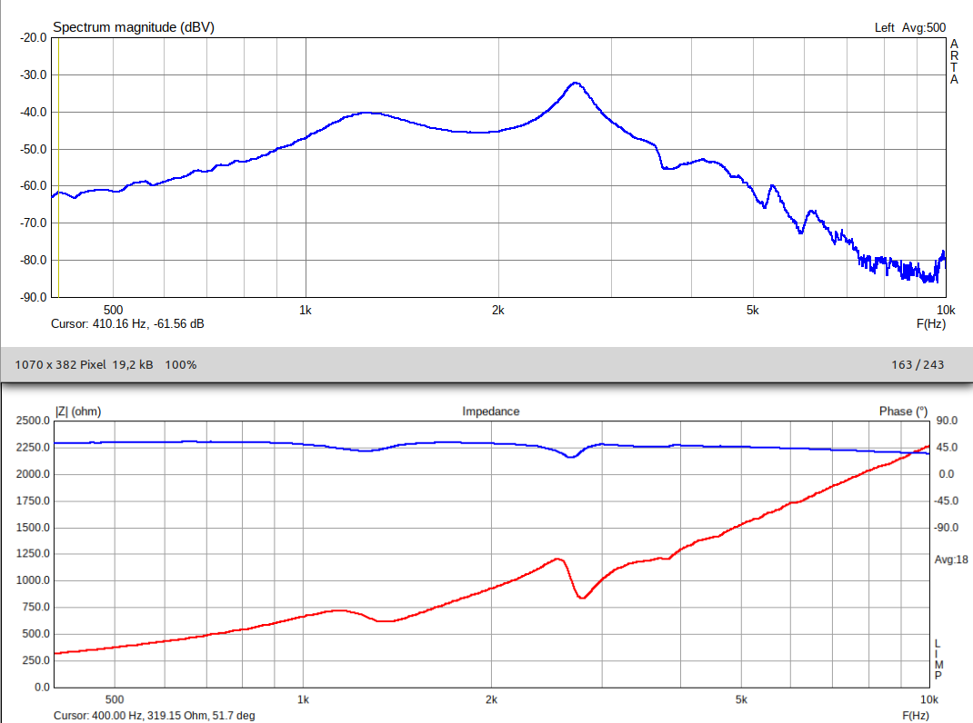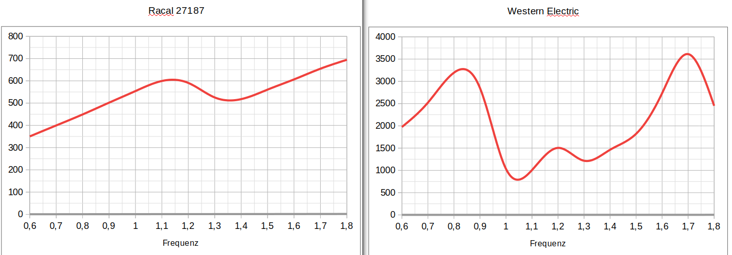 Zunächst zur Differenz der Impedanz der Western Electric (WE). Habe mit 820Ω, 1kΩ und 2,2kΩ Meßwiderstand getestet, das gerechnete Z bei 1kHz lag zwischen 1020- und 1029Ω, also im Bereich der Ableseungenauigkeit (ein AC Voltmeter ist analog). Bei dem Test lag der Hörer auf dem Tisch, setzt man ihn dabei auf die Ohren, steigt das Z, je nach dem wie dicht er aufliegt, bis über 1,5kΩ. Vielleicht ist das die Erklärung für die Differenz. Man bekommt auf diese Weise aber kein eindeutiges Ergebnis, eine kleine Bewegung und der Betrag steigt oder sinkt.