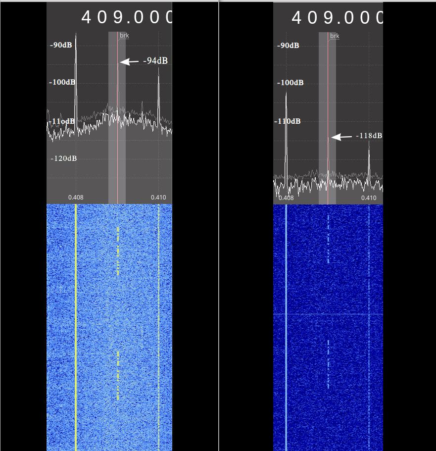 Ganz schöne Fleißarbeit, bin beeindruckt :-) Sehr interessante Tabelle, vielen Dank dafür. Die geringen Differenzen des SNR sind wohl eher keine Überraschung - oder? Ich habe mal einen Test mit dem SDR gemacht, links mit der großen Ferritantenne (siehe oben: 2 Bündel, je 7 Stäbe axial verbunden) und rechts ein übliches Stäbchen 10 x 160. Die Wicklungen haben etwa gleiche Induktivität. Der Pegel differiert um etwa 24 dB, das SNR höchstens um 5 dB - wenn überhaupt. Das Signal der NDB Bake Bruck blieb zwar für einige Zeit relativ konstant aber zur besseren Ansicht hatte ich die Hold-Funktion eingeschaltet.