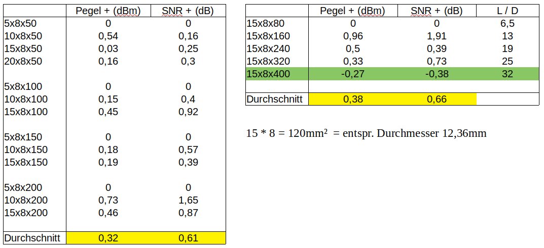 Links die Auswertung der zunehmenden Querschnitte- und rechts der Längen der Stäbe. Habe (aus Faulheit :-) ) nur in der rechten Tabelle die Maße aktualisiert. Scheinbar ergeben sich zwei Schlußfolgerungen: 1. Sowohl die Erhöhung der Querschnitte, als auch die der Längen, lassen den Gewinn an Pegel und SNR um den gleichen Faktor steigen. 2. Offenbar existiert das von Nowack postulierte optimale L/D Verhältnis wirklich (grüne Zeile). Die 5x8er Reihe legt den gleichen Schluß nahe, die 10x8er Reihe nicht ganz. Auf Grund des begrenzten Datenumfangs ist diese Interpretation vielleicht etwas gewagt aber offenbar zeichnet sich ein deutlicher Trend ab. Sehr interessante Sache das.