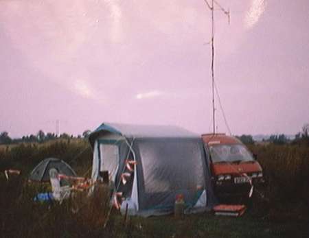 Ausrüstung: Subaro Libero mit "Hauptmast" 4 Meter mitten im Auto durch offene Dachluke. 20 Meter Draht 1,5 mm. "Gegenmast" 4 Meter auf Standfuß mit Haltegewicht (war etwas wackelig). Die Enden des Drahts am Mast waren mit jeweils 2 Meter Plastik-Seil isoliert. Detektor auf Sender eingestellt und so platziert, dass mit einem Feldstecher 10 x 50 vom jeweiligen Aufstellort des Gegenmastes die Feldstärke an einem großen Millivoltmeter (musste von Zeit zu Zeit in der Richtung nachgedreht werden) abgelesen werden konnte. Gegengewicht war ein Erdspieß (Boden war nicht durchgefroren) mit 60 cm Länge und Wasserbegießung mit 20 Liter Wasser in zwei Plastik-Kanistern.