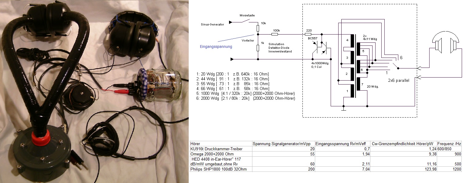 für Detektorversuche waren bei mir neben den erwähnten RAL Kapseln die nicht mehr erhältlichen Kleinhörer von Sennheiser PX100 und PX200 mit einer Schalldruckempfindlichkeit von 114dB (mW) besonders geeignet.