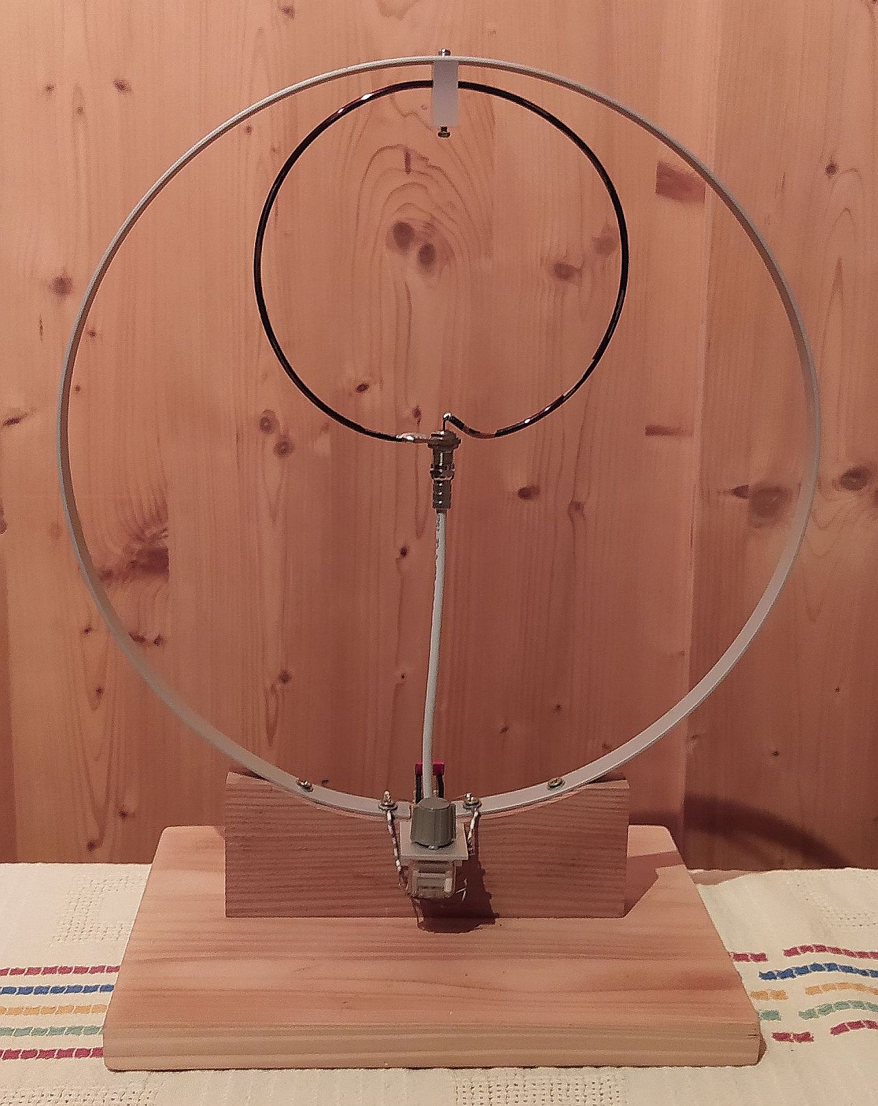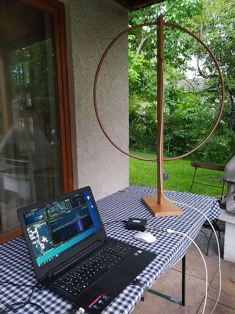 Daher habe ich, total improvisationsmäßig, eine Loop aus 1,5 mm Schaltdraht, freistehend, gebaut. Es hat eine leichte Ei-Form, Durchmesser von ca. 50 cm und 2 Windungen. Größer ist freistehend so ohne weiteres nicht möglich.
