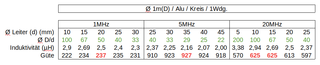 Die grüne Zeile gibt das Durchmesserverhältnis (D/d) des Schleifendurchmessers(D) zum Leiterdurchmesser(d) wieder. Die theoretische Kreisgüte durchläuft bei gegebener Frequenz und steigendem Leiterdurchmesser ein Maximum und fällt danach wieder ab. Das optimale D/d Verhältnis durchläuft mit steigender Frequenz (bezogen auf die Güte) ebenfalls ein Maximum. Quasi von selbst ergibt sich daraus das optimale L/C Verhältnis.