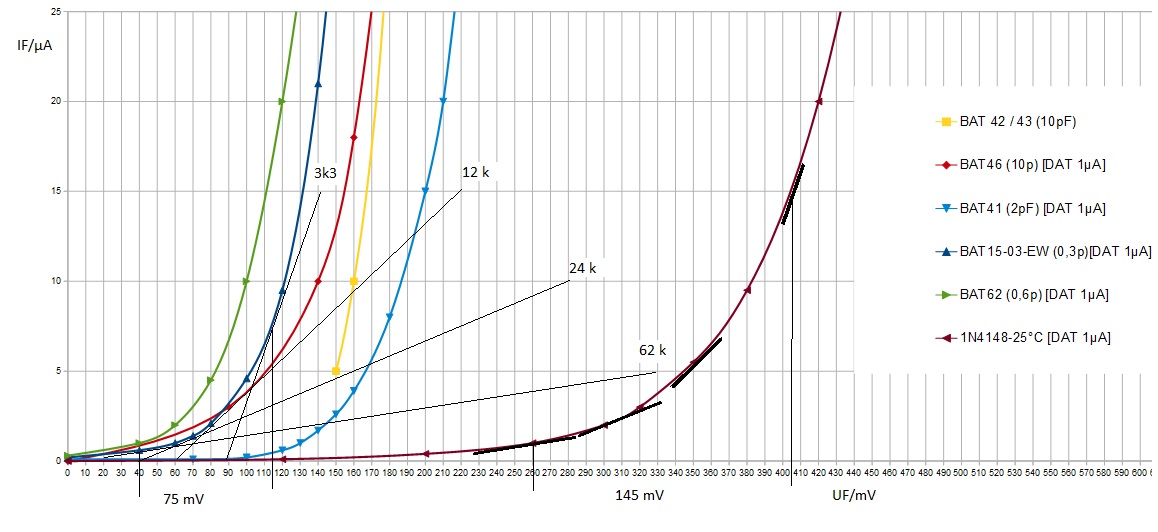 Die schlechten Ergebnisse mit der 1N4148 erklären sich anschaulich, wenn man die Widerstandslinien