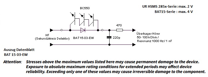 Nach der 4 zerschossenen BAT-15 im Detektor-Aufbau wurde ein Serienwiderstand (470 Ohm) zur