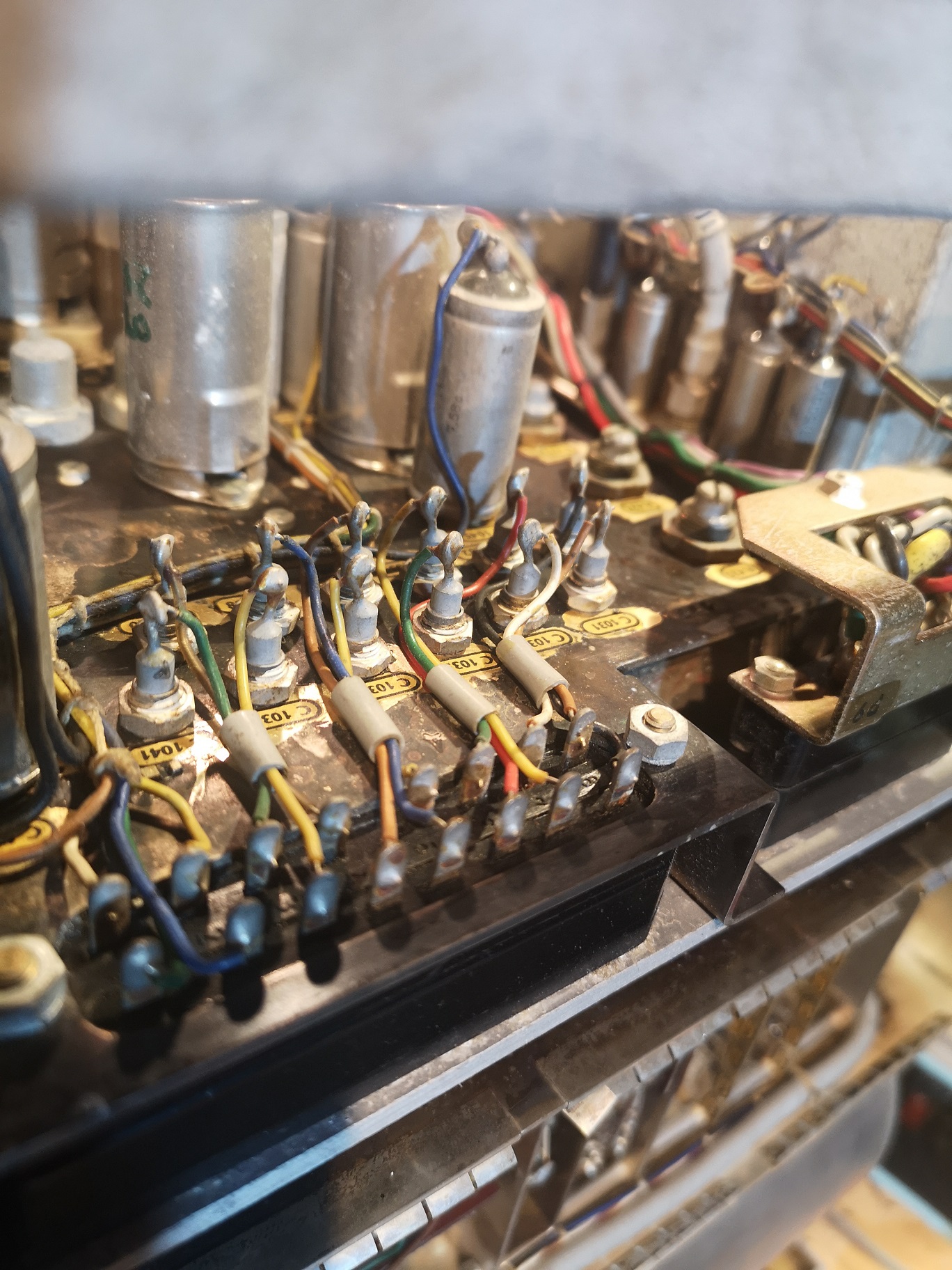 - alle Kondensatoren prüfen. Großes Dilemma bei allen EROID im NF Chassis: außerirdische Abweichungen von der Nennkapazität. Somit kommen die alle raus und frische rein. Ebenso: der Kathodenelko der EL84 sowie der 100/40 in dem Papprohr und der 4/350 auf der Oberseite.