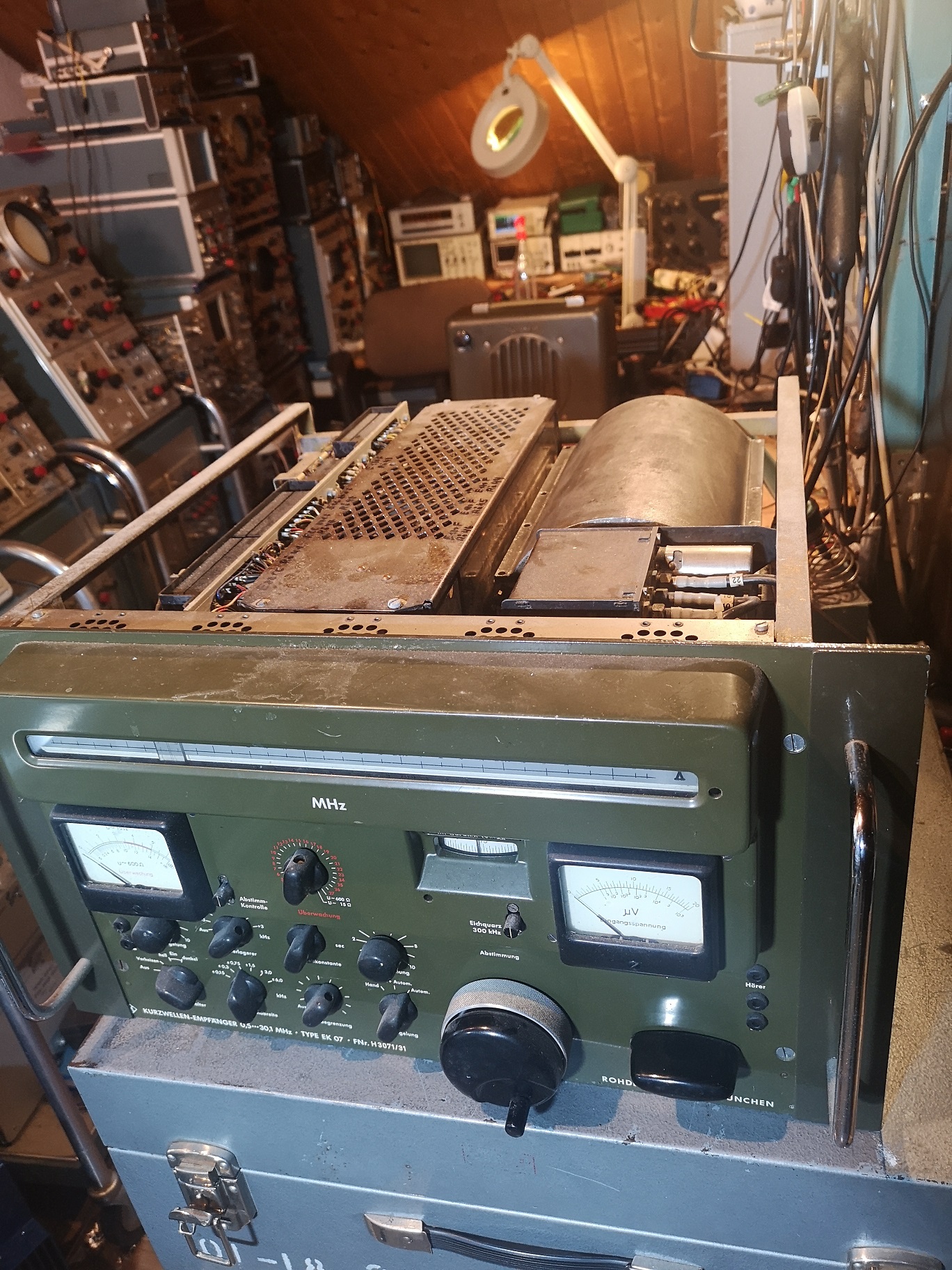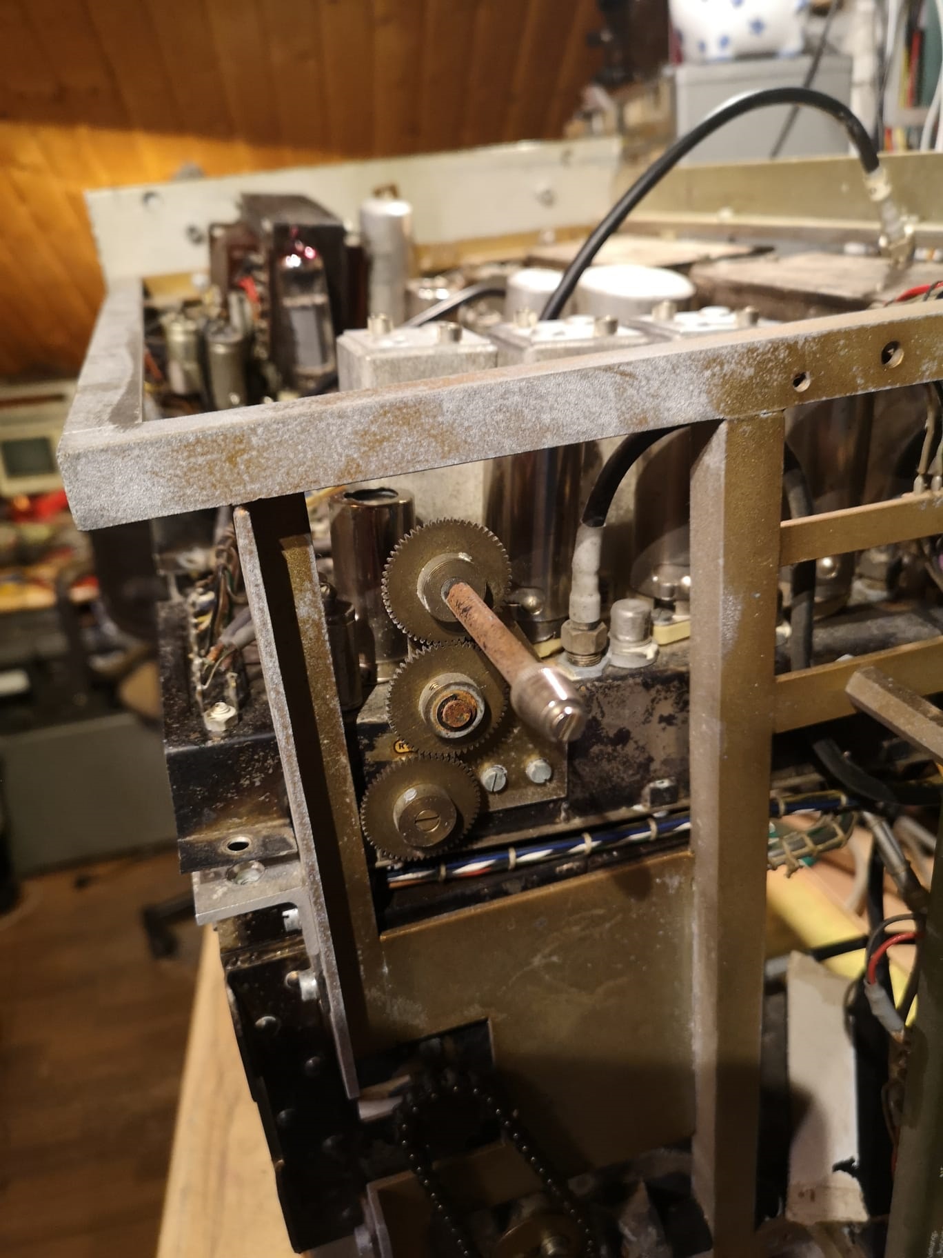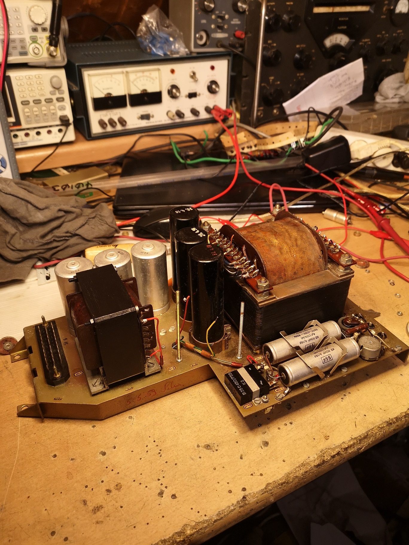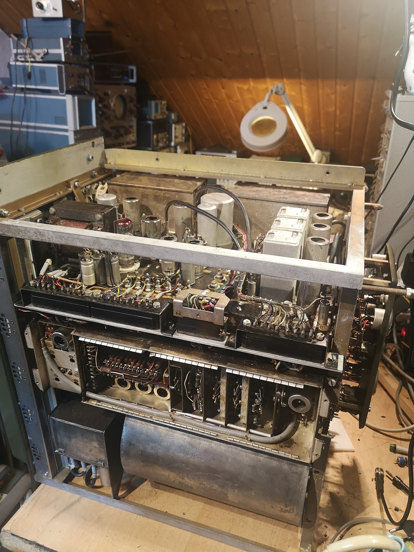 es gelang nach einigem Hin und Her das Gerät einzuschalten. Es kämpft mit zerstörten Kondensatoren, das wird eine längere Geschichte bis die gefunden und erneuert sind. Der Gradeausgleichrichter für die 150V ist hinüber.