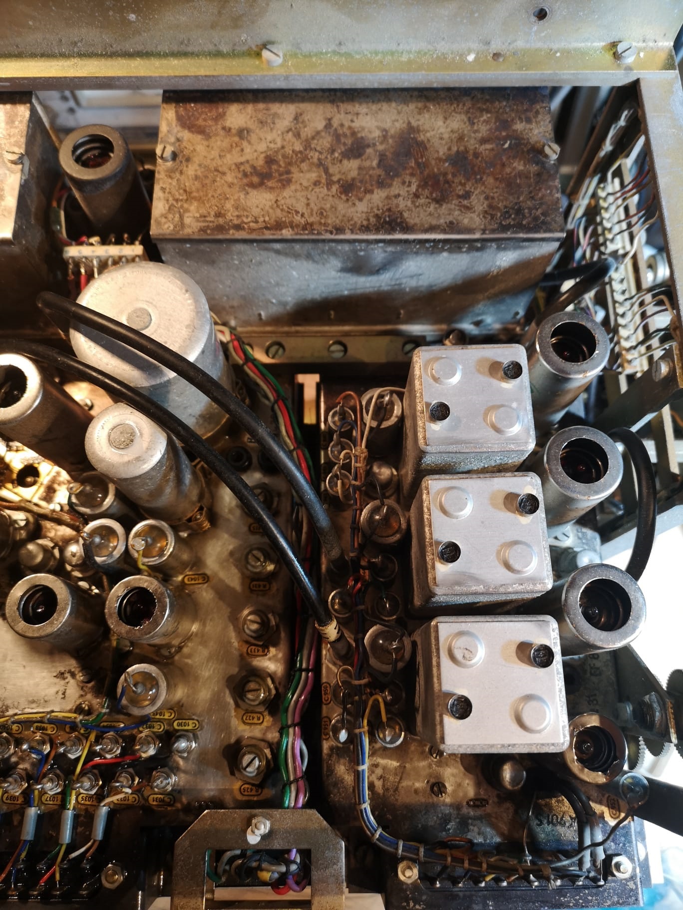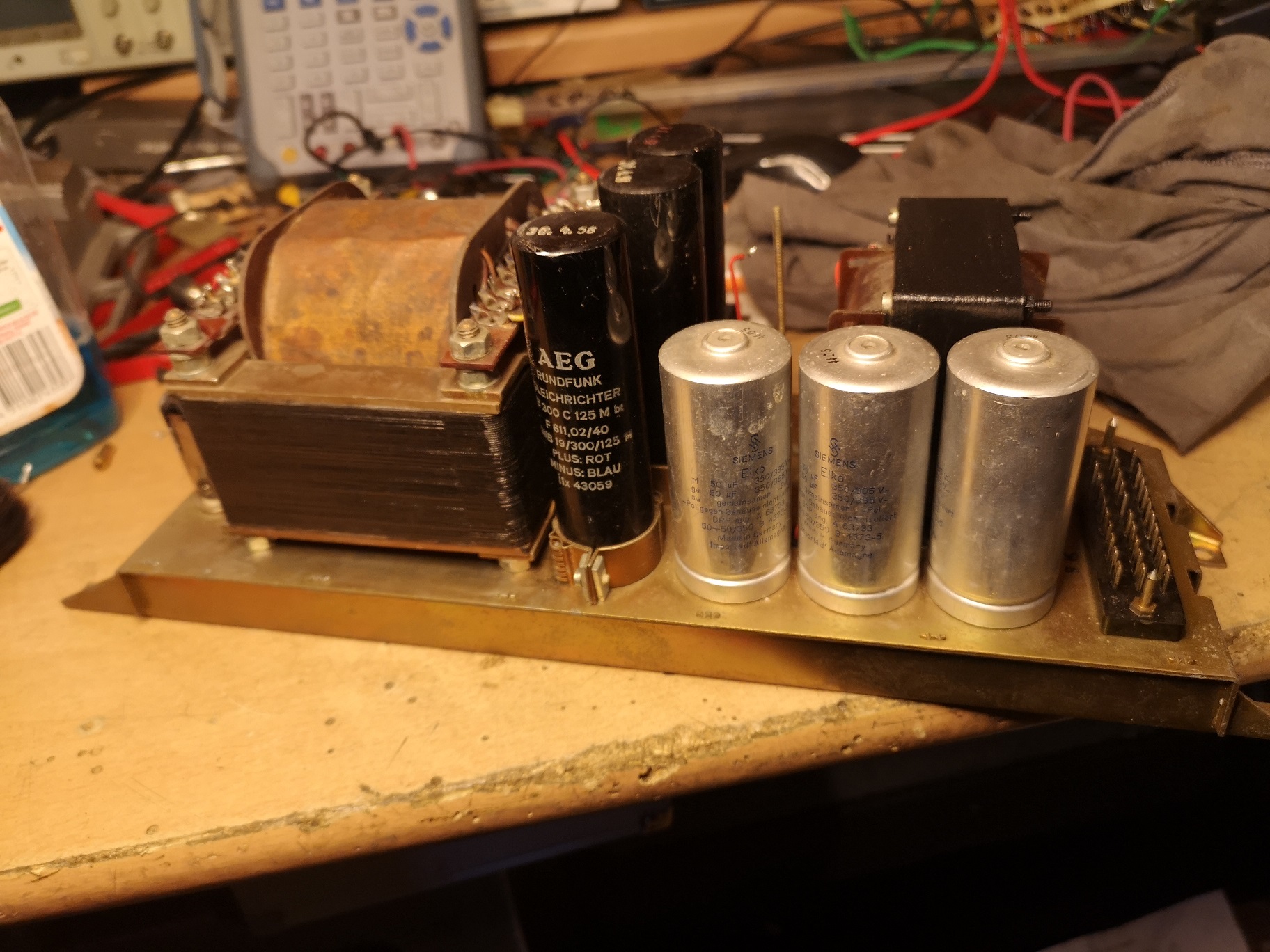 - alle Kondensatoren prüfen. Großes Dilemma bei allen EROID im NF Chassis: außerirdische Abweichungen von der Nennkapazität. Somit kommen die alle raus und frische rein. Ebenso: der Kathodenelko der EL84 sowie der 100/40 in dem Papprohr und der 4/350 auf der Oberseite.
