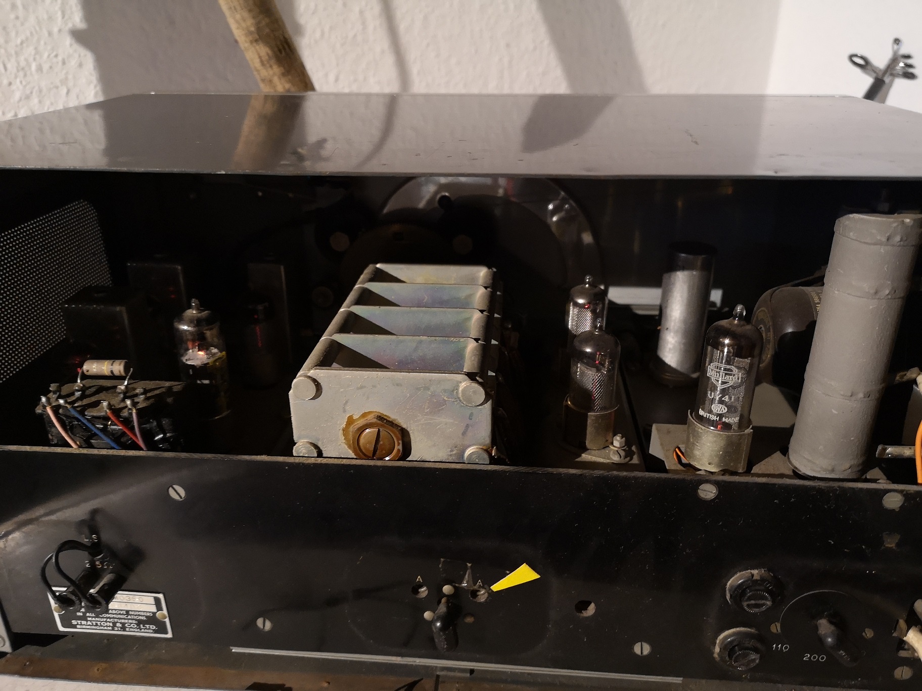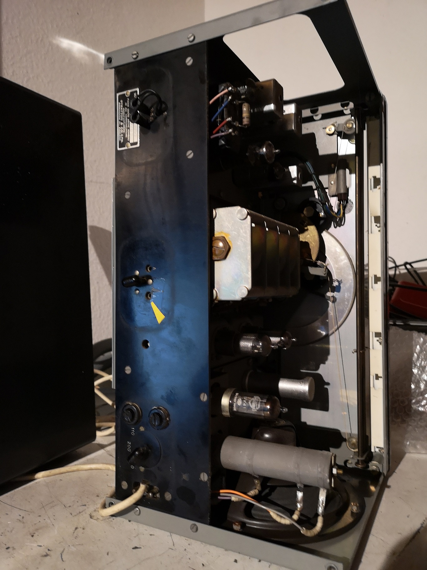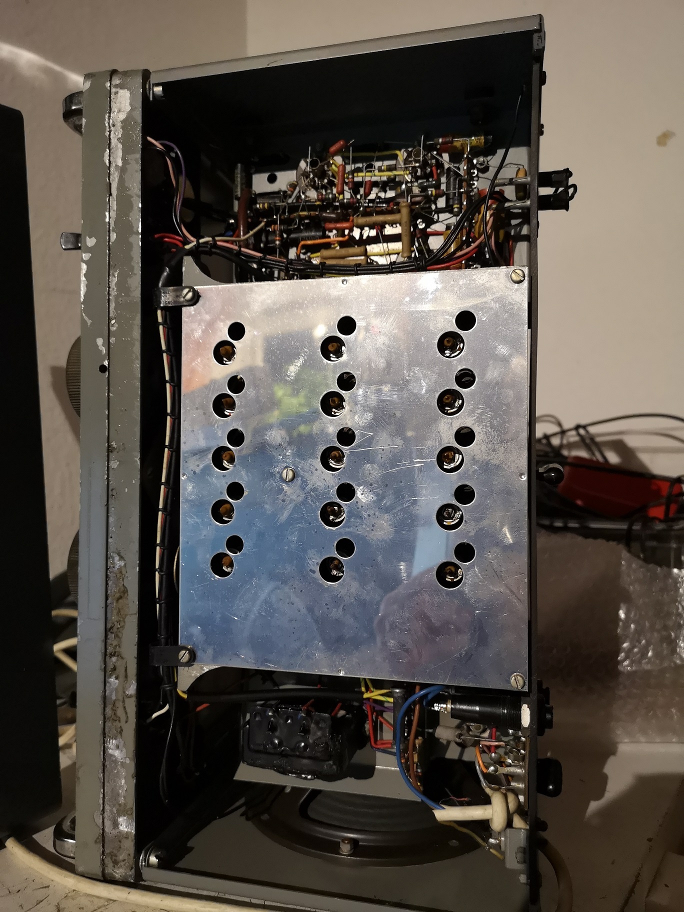 Das Gehäuse liess sich nicht abziehen weil der Vorbesitzer da wohl mit Heißkleber rumgepanscht hat. Ich hab es mehr oder weniger gewaltsam auseinanderbekommen. Das Lautsprechergitter hat 2 Löcher und ist lose. Eine Röhre war defekt Es gibt Mengen an Dreck und massiven Kellergeruch wenn es läuft Es ist dunkel, nur diese DM71 leuchtet. Allerdings scheint es für Licht vorbereitet zu sein. Es ist ein U-Radio, 4x UAF42, eine UCF42, UL41, UY41, DM71 5 Bänder.