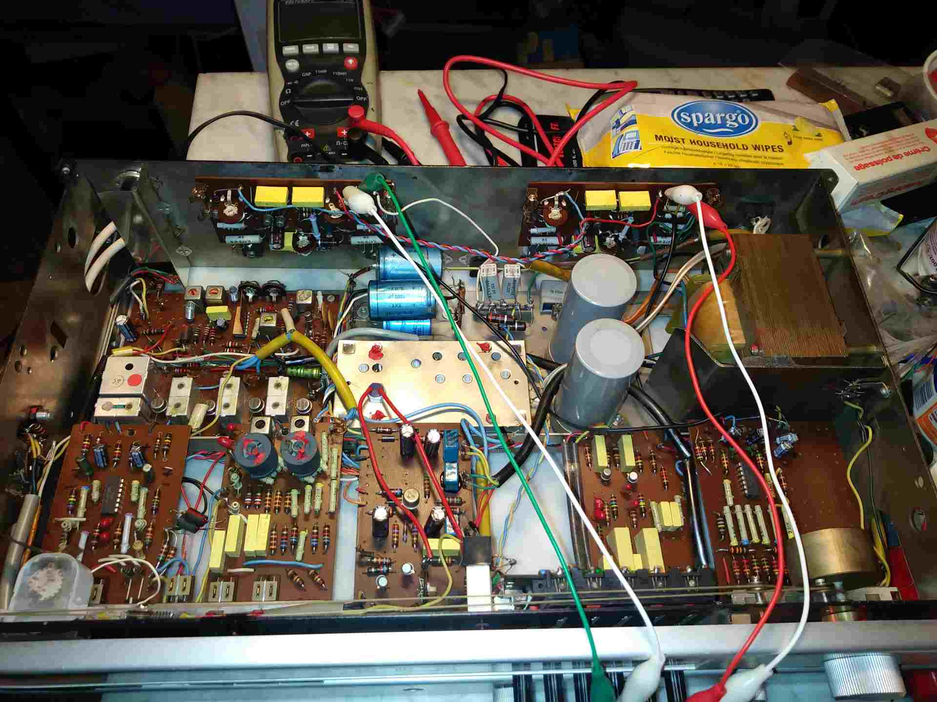 Mit verbastelt meinte ich das wohl schon jemand versucht hat das Gerät zu "reparieren" und nicht erfolgreich war. Es wurden diverse Kondensatoren getauscht aber das Gerät tat es immer noch nicht und so wurden die Versuche wohl eingestellt. Da Netzspannung da war hab ich beide Endstufen direkt mit einem Signal von meinem Minidisc Walkman versorgt. Diese liefen ohne Nennenswerte Probleme. Dann habe ich weiter gesucht und bin auf die Netzplatine gestoßen auf der besagte drei Gleichrichter verbaut sind. Diese wahren alle drei hin. Nach dem tausch durch die etwas kleineren. war zumindest ein Teilerfolg da. Über die Monitorbuchse konnte ich ganz normal abspielen. UKW Aux und Phono sind immer noch tot.Auf der Netztplatine (Bild) ist zwischen den beiden dicken roten Leitungen ein Transistor zu erkennen. Dieser wird so meine ich zu heiß. Als Laie bräuchte ich daher einen Plan um weitere Messungen machen zu können.