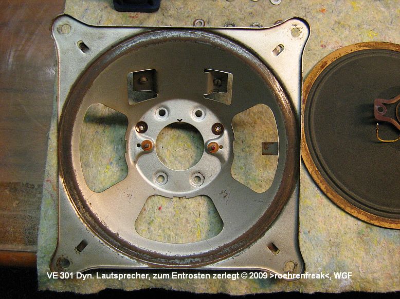 Bild 2: Der LS ist komplett zerlegt. Vorsicht walten lassen mit der losen Membran und den Anschlussdrähten. Den Magneten zum Schutz vor Verunreinigung mit magnetischen Partikeln (Rost!) weit weg und gut verpackt aufbewahren! Nun den Korbrand von allem losen Rost und Schmutz befreien.