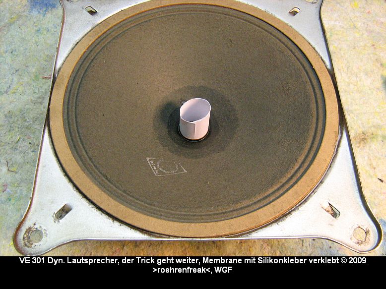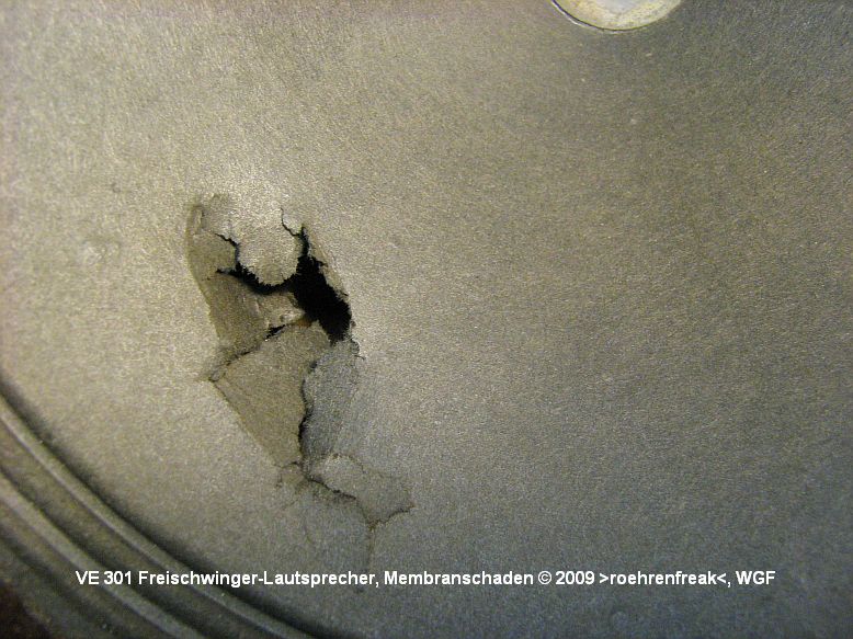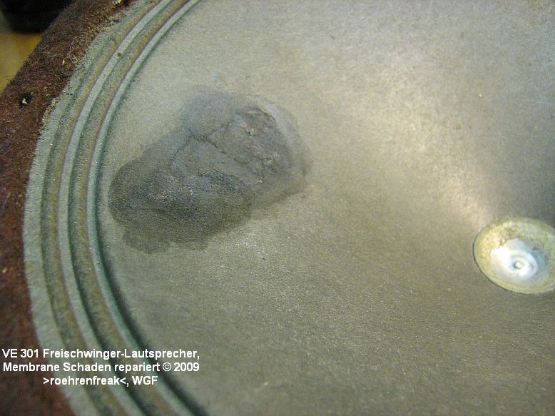 Bild 1: Ein Freischwinger-Lautsprecher aus einem VE301W mit beschädigter Membrane. Die "Rissohren" sind weich und knitterig. Erste Massnahme: Die Rissohren vorsichtig so in Form bringen, daß die Ränder Stoß-an-Stoß sauber und möglichst glatt zusammen gefügt sind.