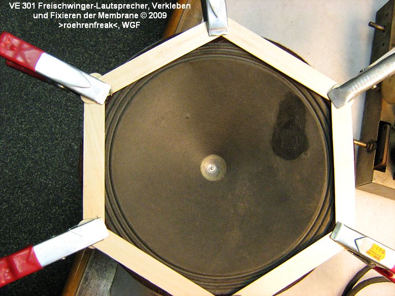 Bild 4: Membran und Korb sind "verheiratet", der Korbrand wurde vorher mit einer dünnen, gleichmässigen Raupe essigfreiem Silikonkleber versehen. Nun wird der LS auf einer ebenen, stabilen Unterlage ringsum gleichmässig fixiert bis der Kleber abgebunden hat.