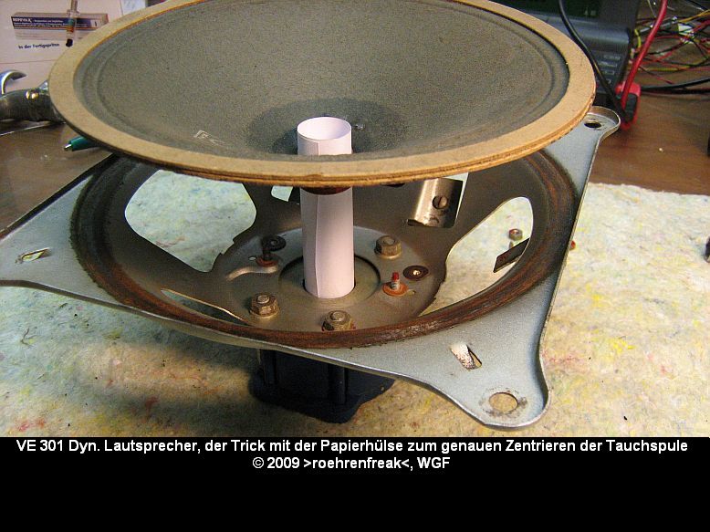 Bild 3: Mit Schreibpapier eine Zentrierhülse rollen, welche exakt über den Kern des Magneten und in die Innenwandung der Tauchspule passt. Hier ist Fingerspitzengefühl gefragt. Beim späteren Zusammenschieben darf sich die Hilfskonstruktion unter keinen Umständen verkeilen. Die Hülse muss sich noch bewegen lassen!