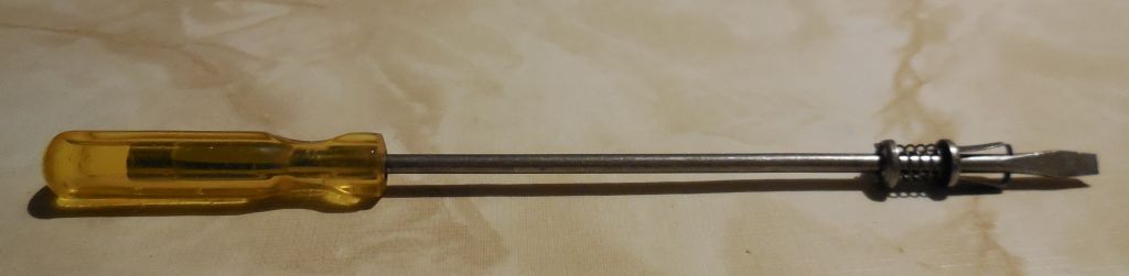 Hier ein Beispiel, bei dem ein Schraubendreher eine geteilte Klinge besitzt, die sich mechanisch spreizen lässt und somit eine Schlitzschraube fixiert: