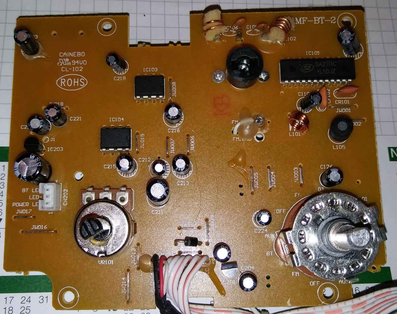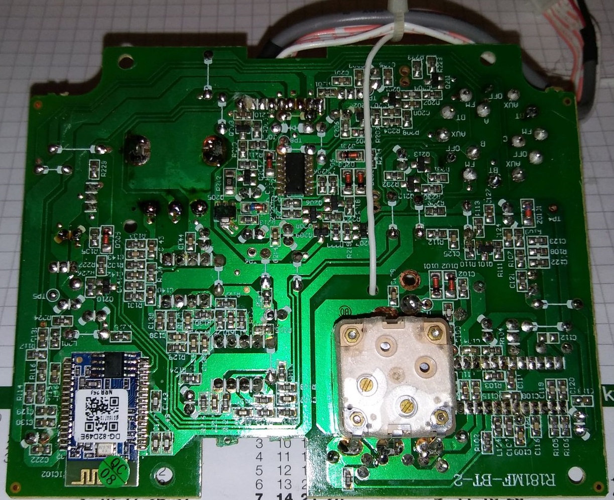 Folgende Bezeichnungen konnte ich auf den Bauteilen entziffern: Radio-IC: SA2111C von Silan Microelectronics (könnte auch AM, wurde aber leider nicht genutzt), 2x MC4558L (Dual-OPV), Bluetooth-Modul: DG-82D49E, NF-Verstärker ST STA540 (4x13W Quad-Verstärker) . Bei einem SMD-IC im SO16-Gehäuse wurde die Beschriftung entfernt.
