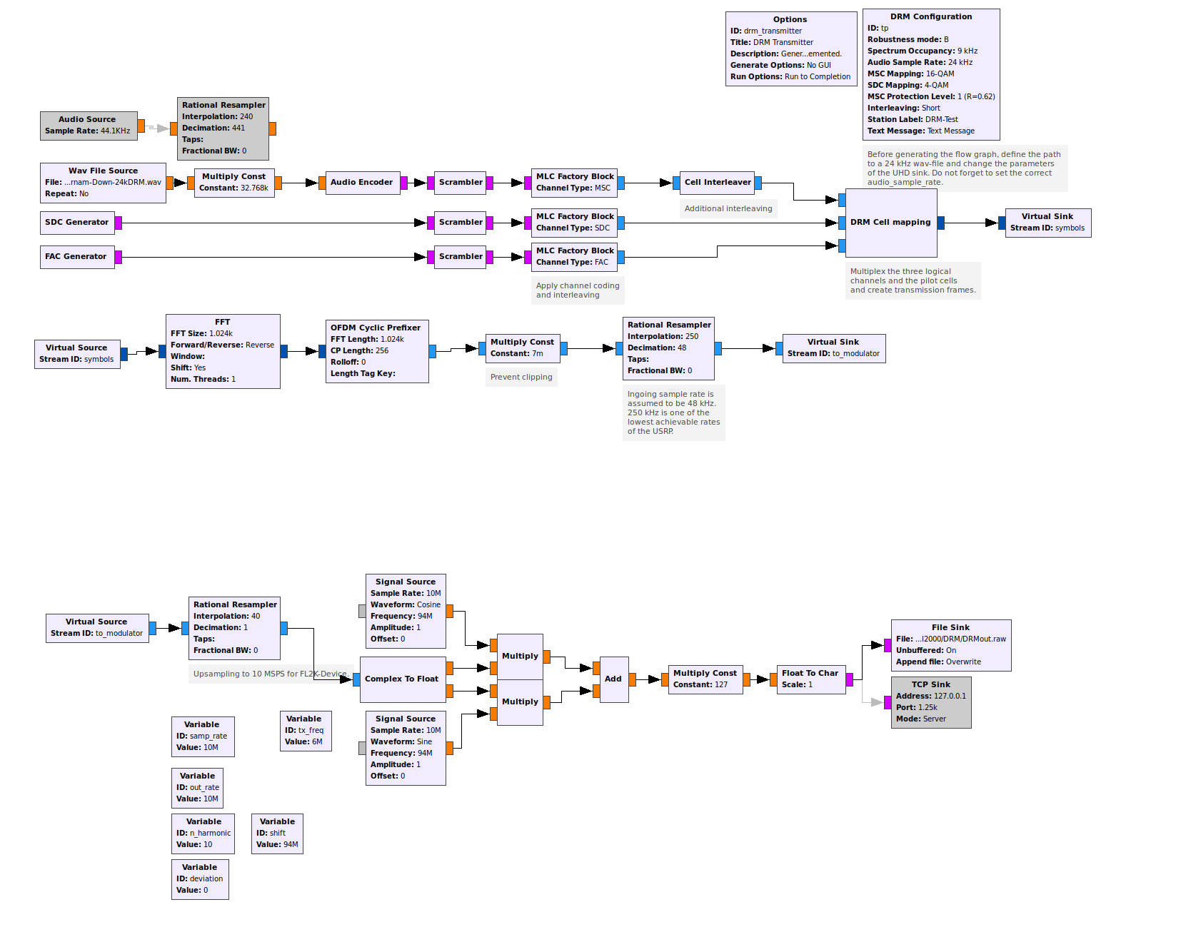 Die berechnete und sendefähige Hochfrequenz kann wahlweise in eine Datei geschrieben oder per TCP/IP an die FL2K-Grafikkarte übertragen werden. Als Modulationssignal wird ein mit 12 oder 24kHz gesampletes WAV benötigt, das kann auch ein in diesem Format vorliegender (gewandelter) Livestream einer Internetradiostation sein. Die DRM-Sendeparameter werden im Block "DRM Configuration" festgelegt.