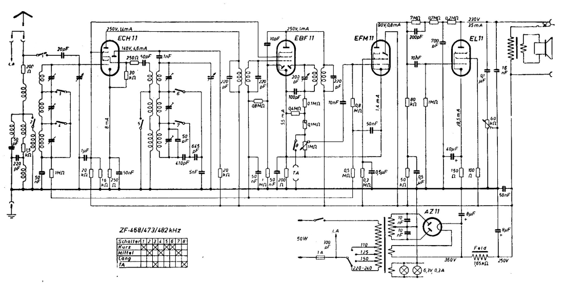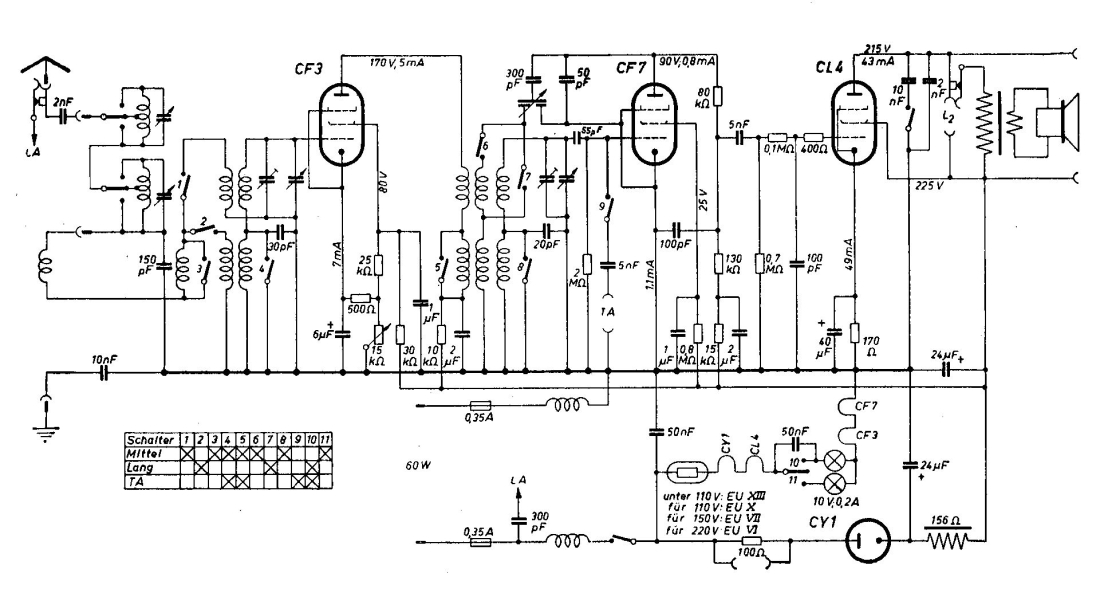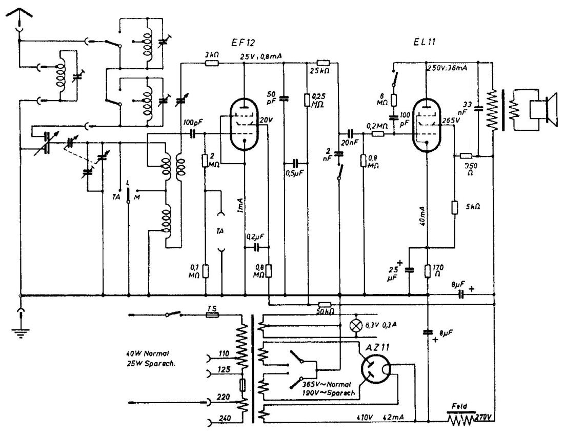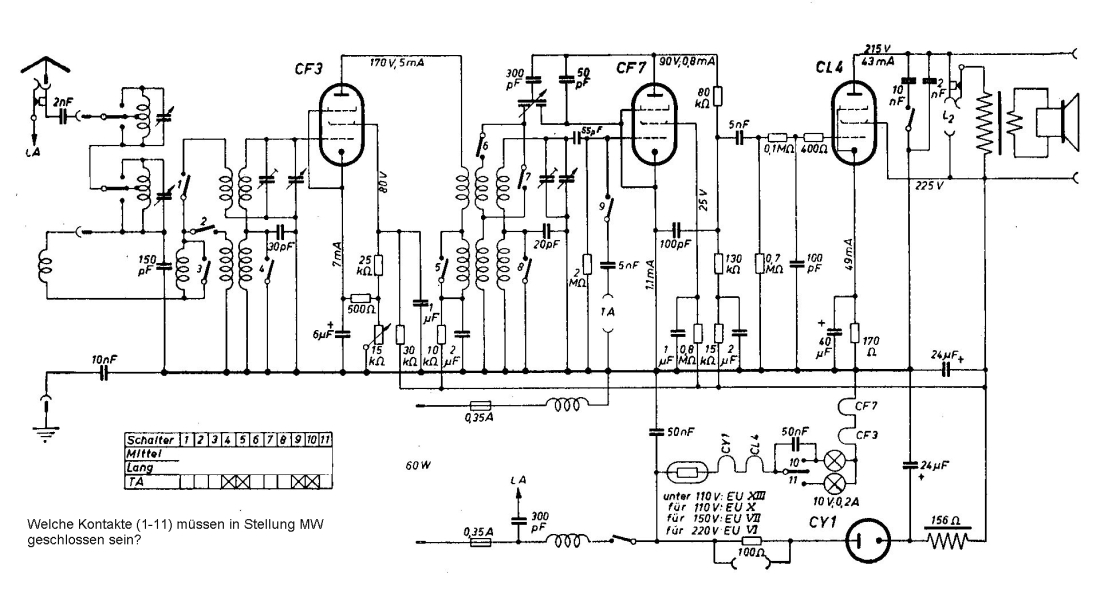hallo Rainer, ich bins schon wieder Bauteil. der 200 Ohm ist überflüssig an der ECH, C System: 410pF, 645pF und 5nF würde ich gegen Brücke tauschen. An der Netzantenne in Serie mit der Leitung zum Trafo müßte ein hochisolierender C rein. An der Versorgung: parallel zu den Birnchen müssen noch die Heizungen dran. Am Ausgangsübertrager wird die Primärwicklung rausgeführt und sogar +Anodenspannung. Das sollte doch besser der Sekundäranschluß sein, und abschalten per Stecker den Lautsprecher.
