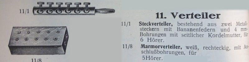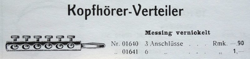 ja so ist es: Eine Verteilerleiste für bis zu vier Kopfhörern. Die wurden einfach parallel geschaltet. So sank der Widerstand von 2000 auf bis zu 500 Ohm, immerhin eine gewisse Fehlanpassung an der NF-Endröhre. Ging aber wohl so halbwegs.