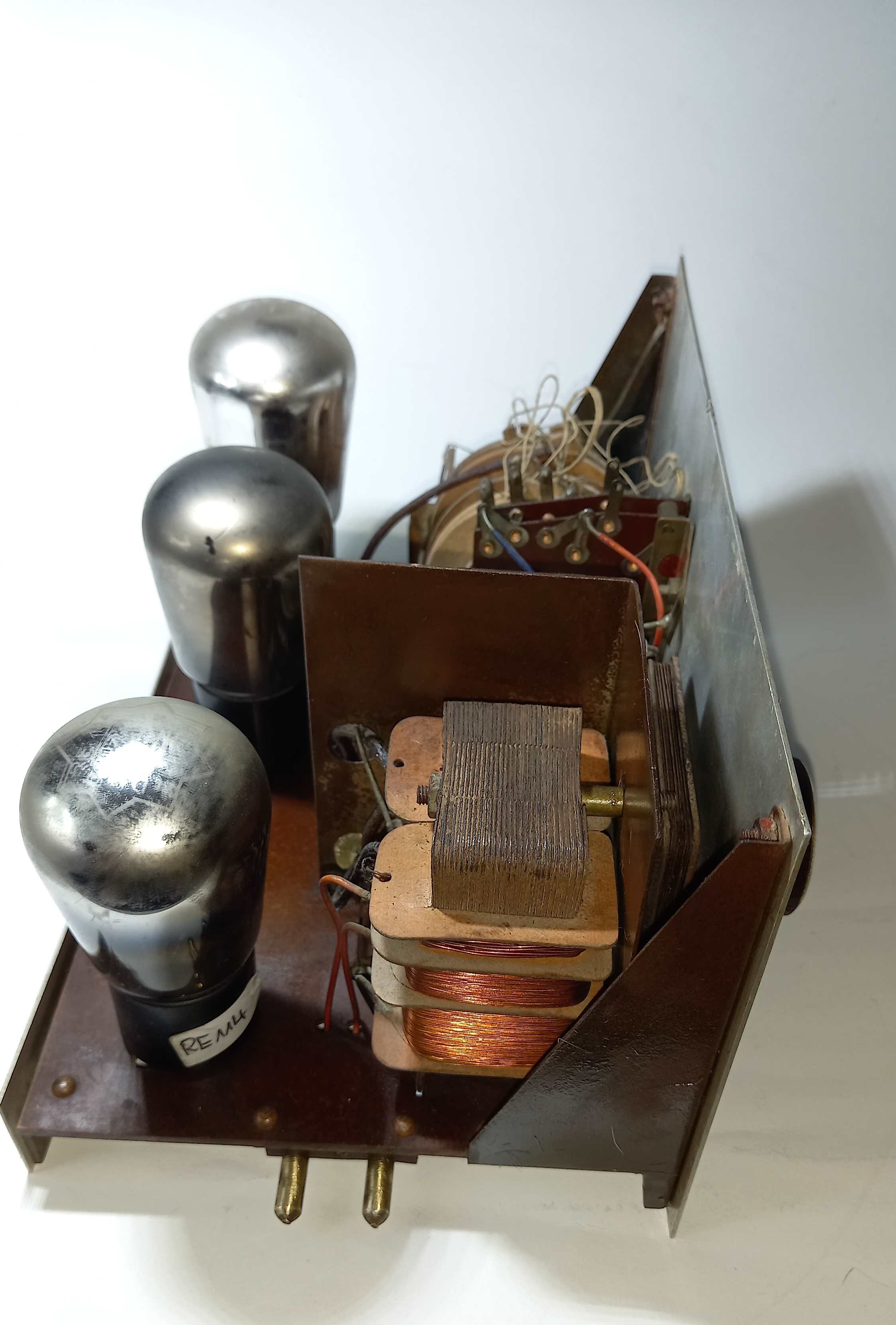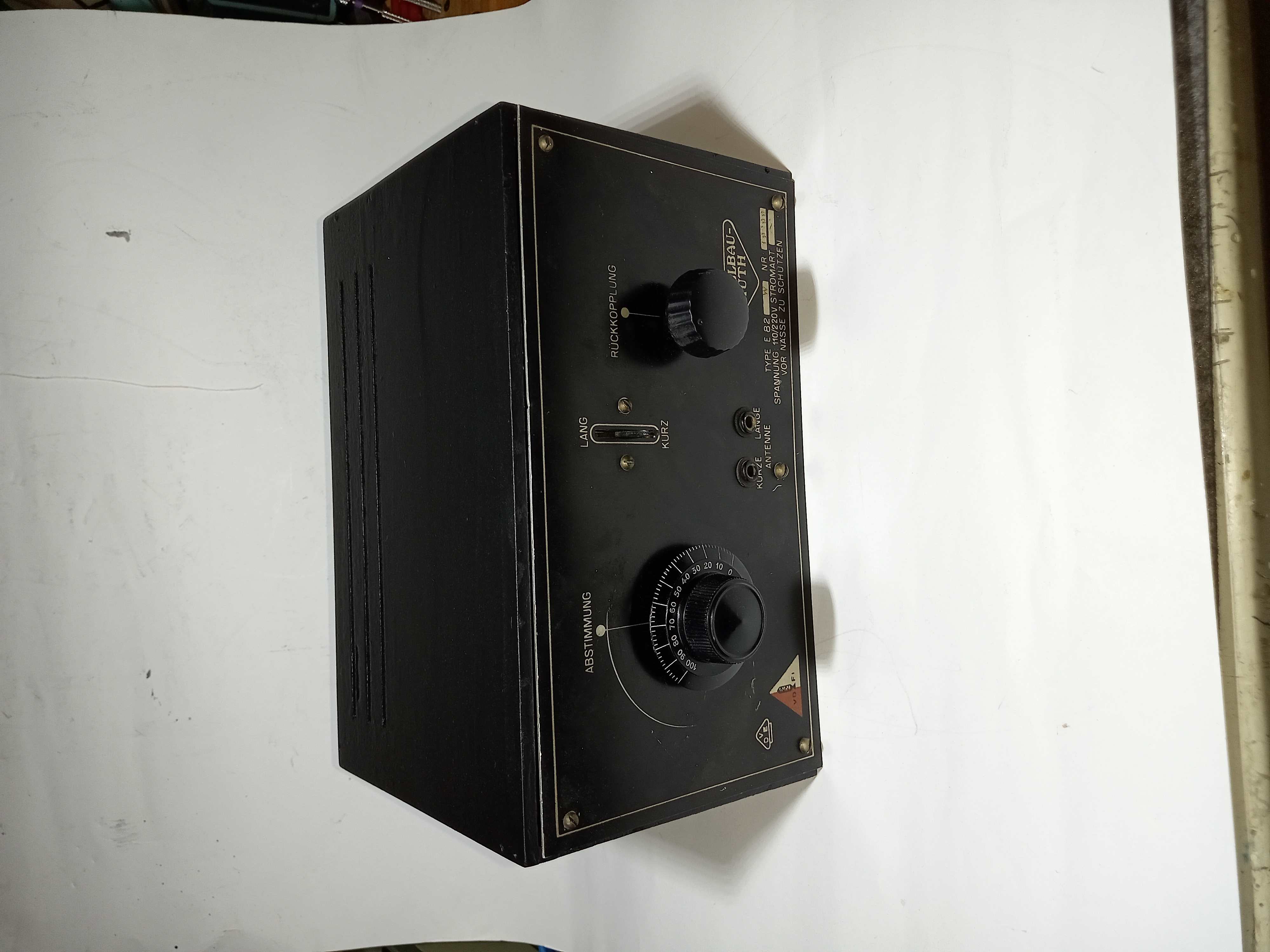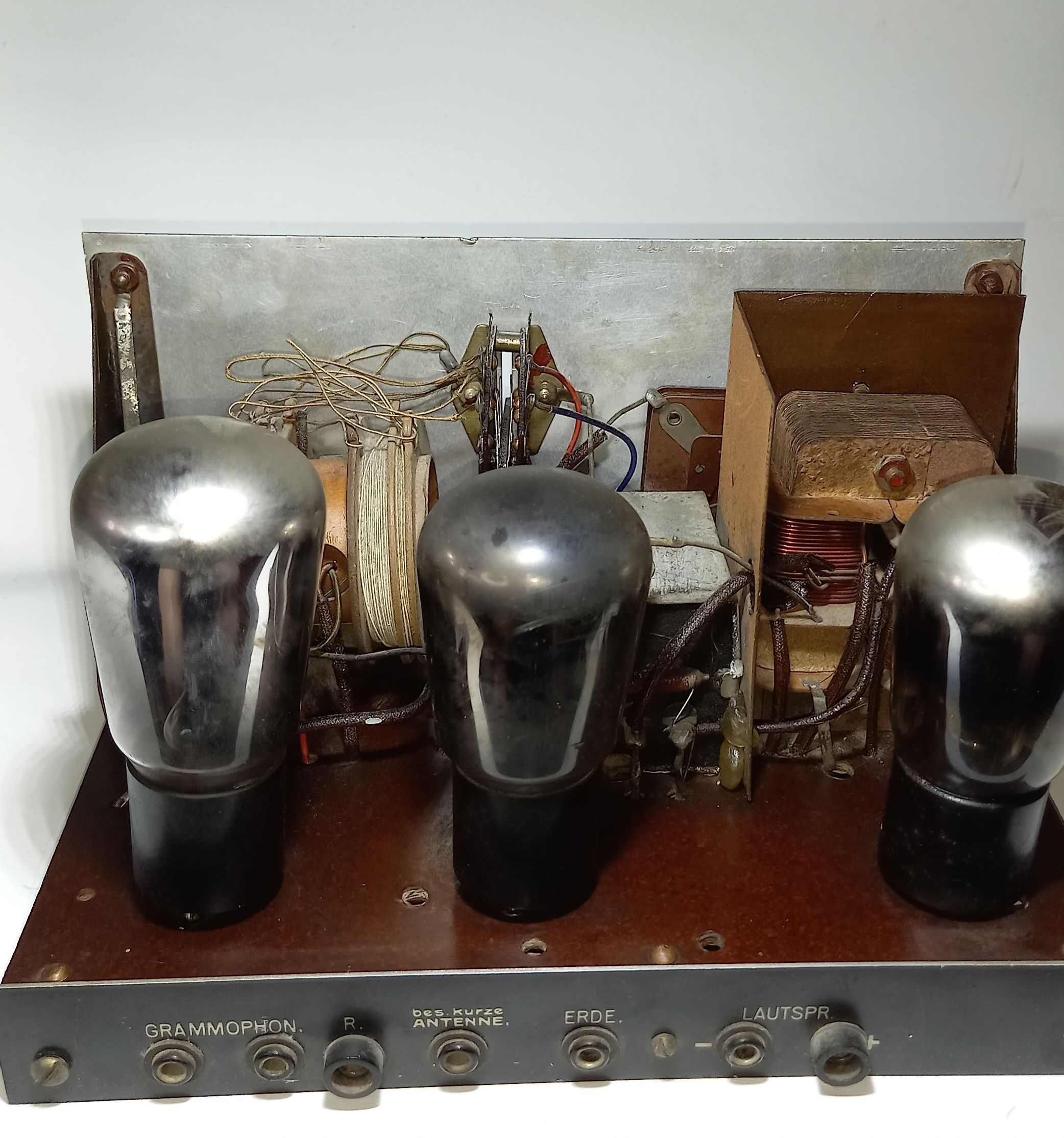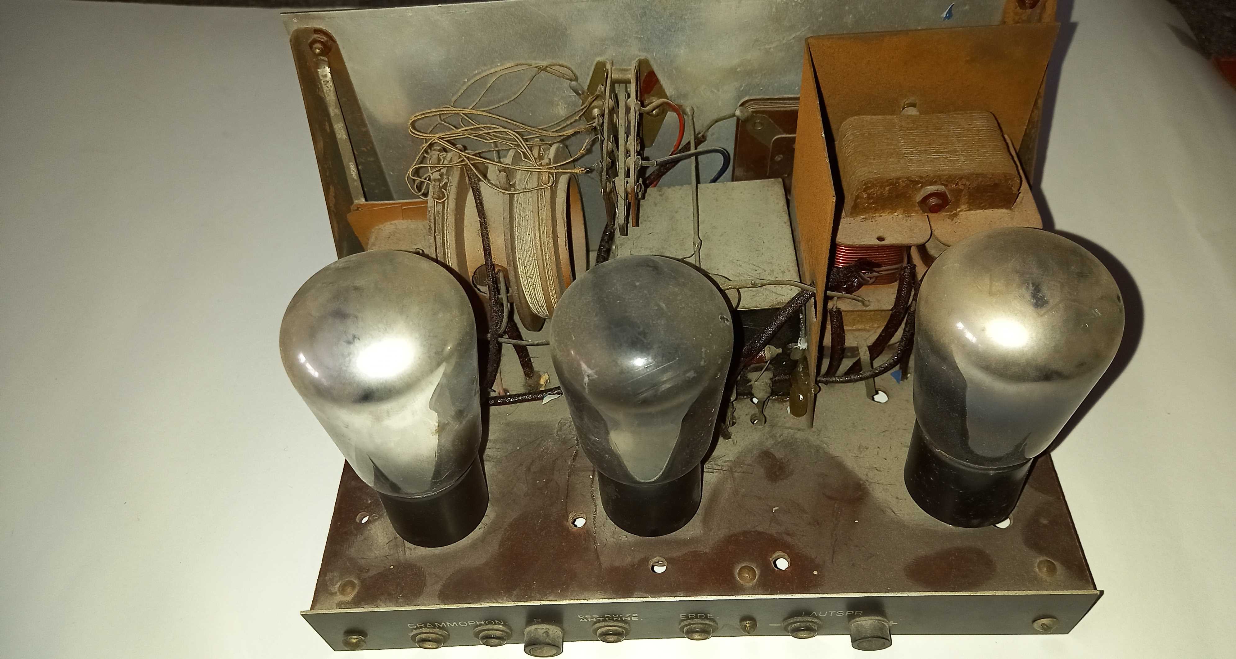 Leider ohne Gehäuse. Ein Eigenbaugehäuse musste also her. Nach Prüfung und Regeltrenntrafo hatte ich Erfolg. Abends gegen 22 Uhr und Antenne sowie Erde Anschluss mit 2 Kiloohm Kopfhörer sind Sender zu hören.