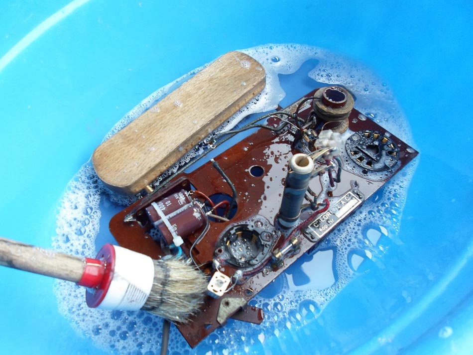 Was ich ebenfalls bewundere, ist der Mut aller Restaurateure, ein (teilbestücktes) Chassis zwecks Reinigung in ein Wasserbad zu stecken. Irgendwie kann ich mich mit dieser Methode (noch?) nicht anfreunden, es fehlt mir dazu eben der Mut... Das mag vielleicht auch in meiner Kindheit begründet sein, als die Eltern immer predigten "Strom und Wasser zusammen - das ist gefährlich".