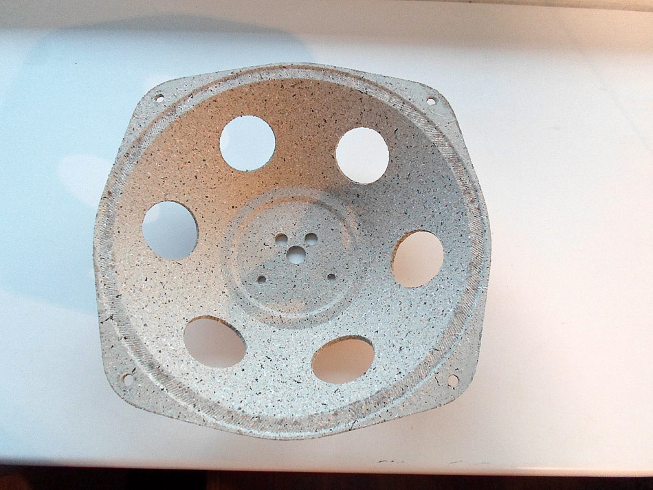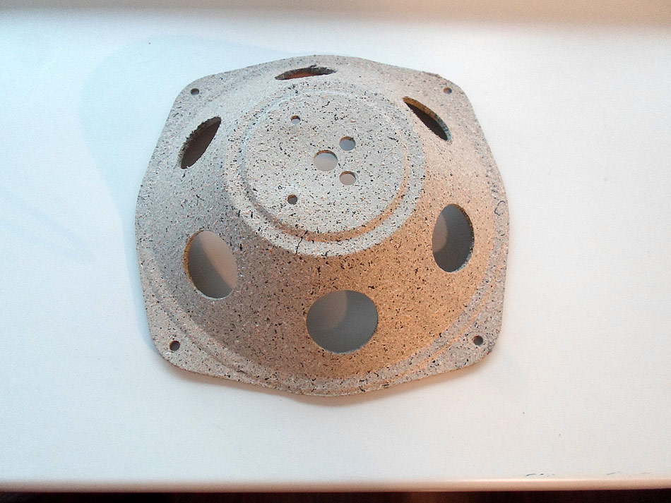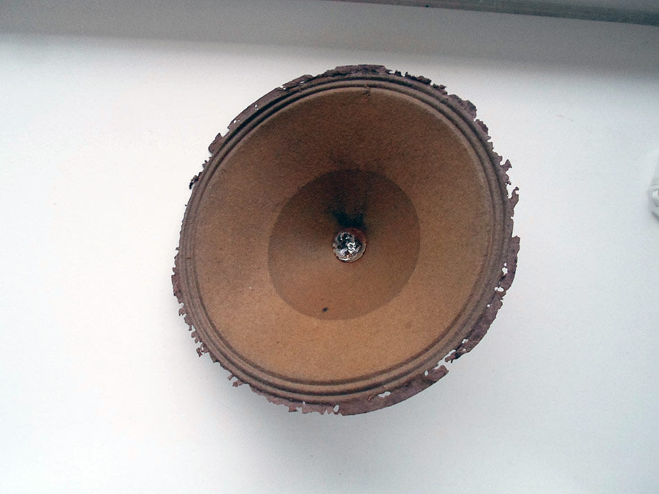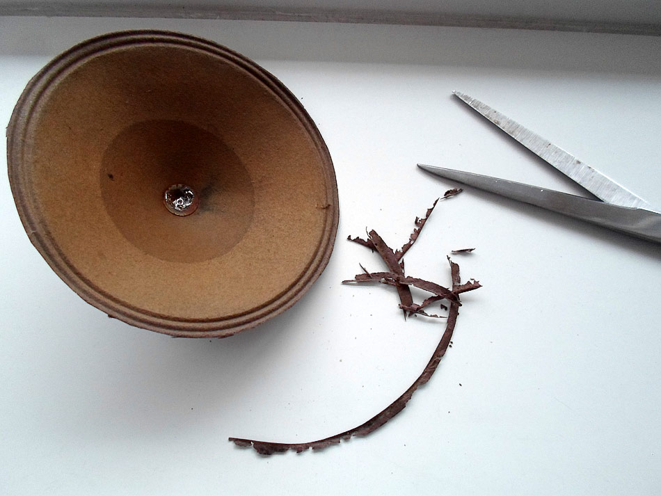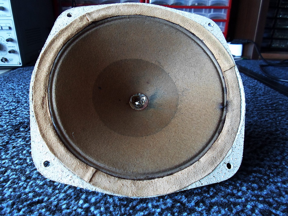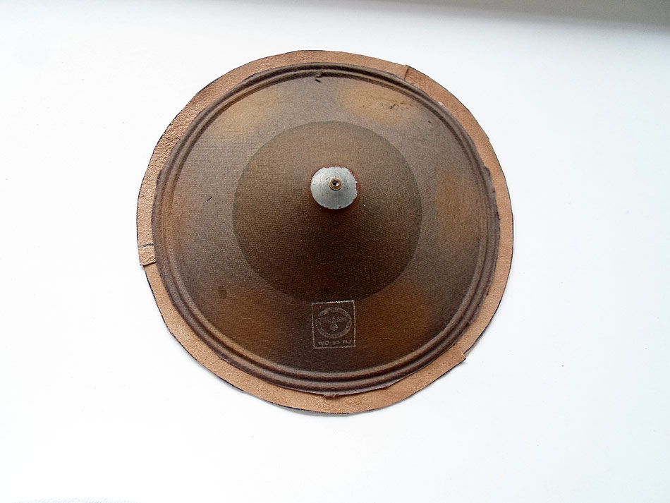 Mit Membran ist es schon nicht so einfach. Die ist sehr stark beschädigt. Ich habe als Reparaturmittel ein sehr dünnes Leder rausgesucht. (eine alte Jacke für 5 ¤ auf dem Flohmarkt gekauft). Die notwendige Teile ausgeschnitten und geklebt.