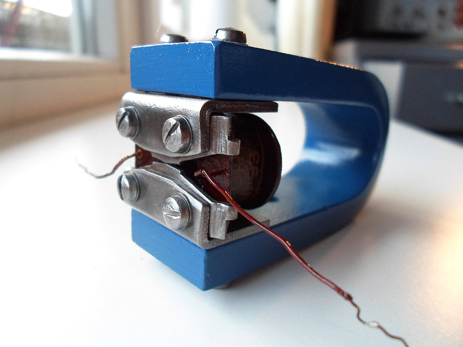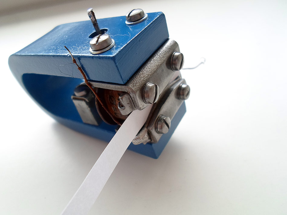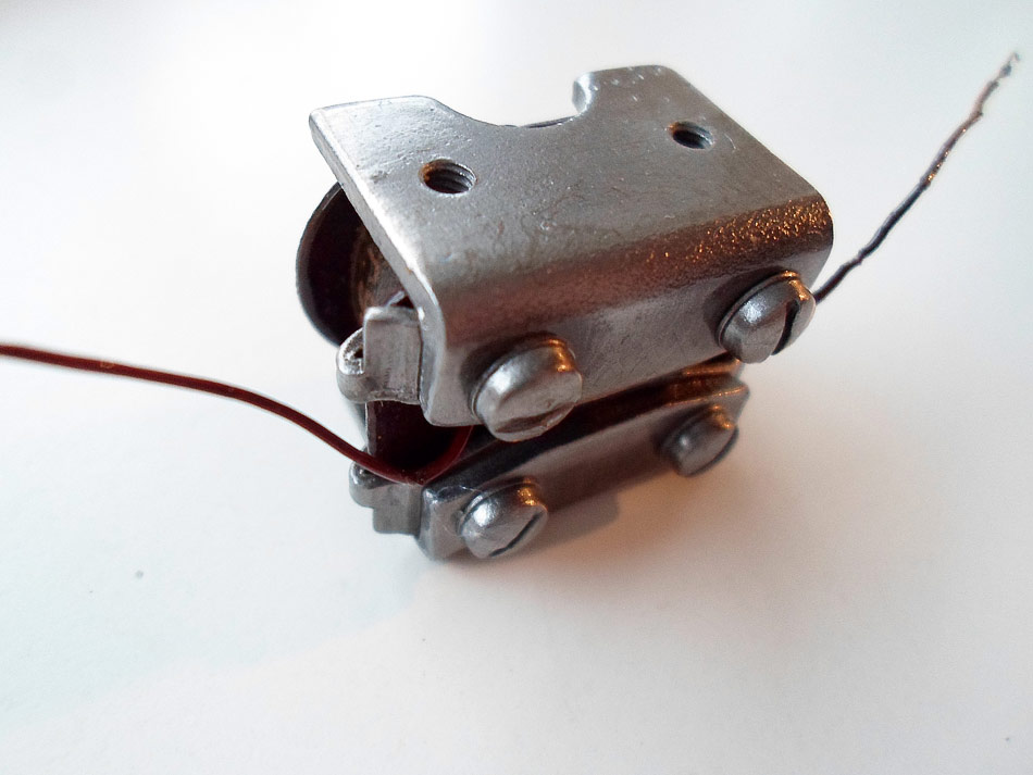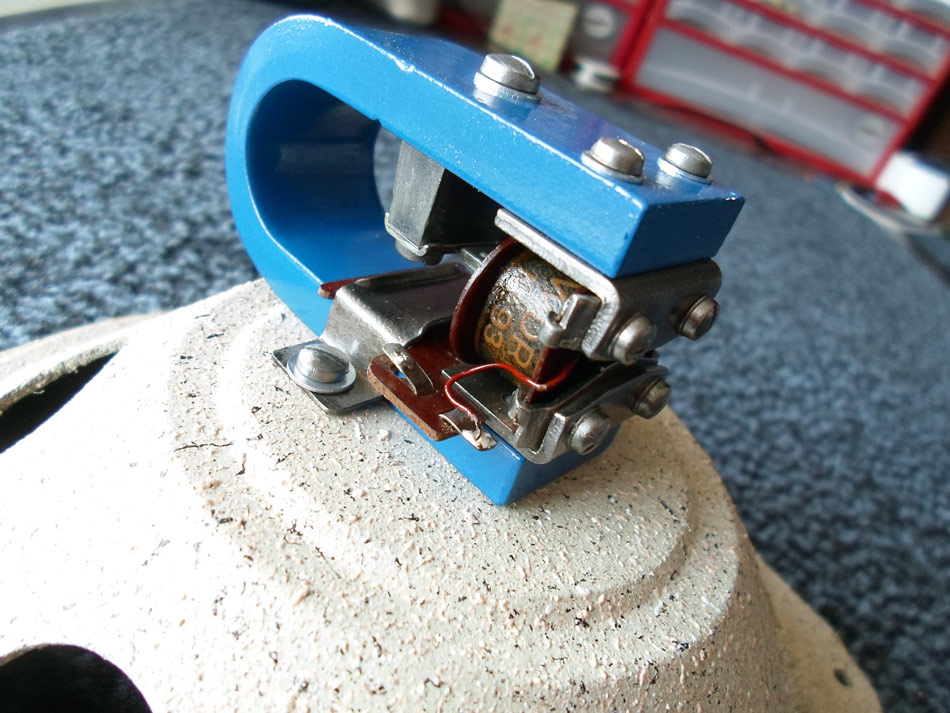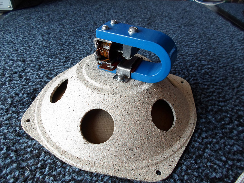 und jetzt geht weiter. Die Nadel justieren und nicht vergessen das Federblech der Zunge so verbiegen, dass die Zunge bisschen nach oben steht ( Strom in Ruhezustand) und den Stößel mit der Membrane, die sich in Ruhestellung befindet, verlöten. Da für fädele ich zwischen Wickelkörper und Polblechen waagerecht, ein schmalen Streifen Papier hindurch. Jetzt schiebe ich die Zunge mit leichtem Druck gegen den Papierstreifen und drehe die Klemmschrauben fest. Papierstreifen herausziehen, alle Schrauben festziehen und fertig.