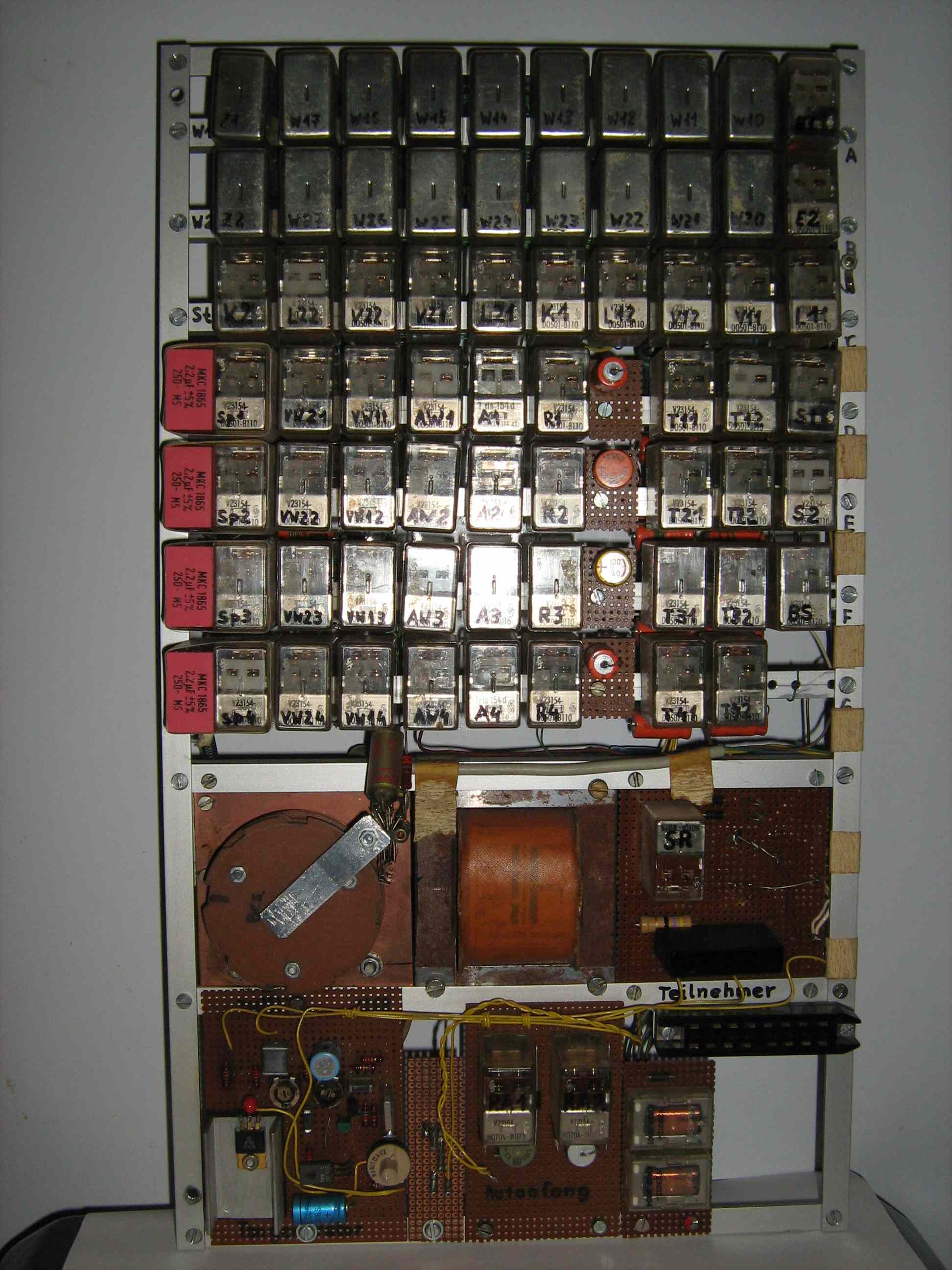 Eine kleine Telefonanlage nur für Impulswahl, Selbstbau (jeder echte Fernmeldehandwerker alten Schrot und Kornes würde nun die Hände über dem Kopf zusammenschlagen), kann vier Teilnehmer, zwei Gespräche zur gleichen Zeit, Konferenzwahl, eine Amtsleitung, elektronischer Ruftongenerator, elektromechanischer Ruf/Signaltaktgeber Leistungsmerkmale: Rufnummern 1...4 = Teilnehmerrufnummern Konferenz: Vorwahl 5 = Einleiten Konferenzwahl, dann gewünschte Teilnehmernummern wählen, Nachwahl 6 = Konferenzteilnehmer anrufen (der Rufton bleibt im Hintergrund so lange hörbar, bis der letzte Teilnehmer der Konferenz den Handapparat aufgenommen hat). Die Konferenz endet mit Auflegen der Teilnehmer. Amtswahl einleiten: Vorwahl 6, warten bis Amtswählton ertönt, dann Rufnummer wählen. Besetzt: Sollte ein Teilnehmer/die Amtsleitung besetzt sein, ertönt das "Besetzt-Zeichen"