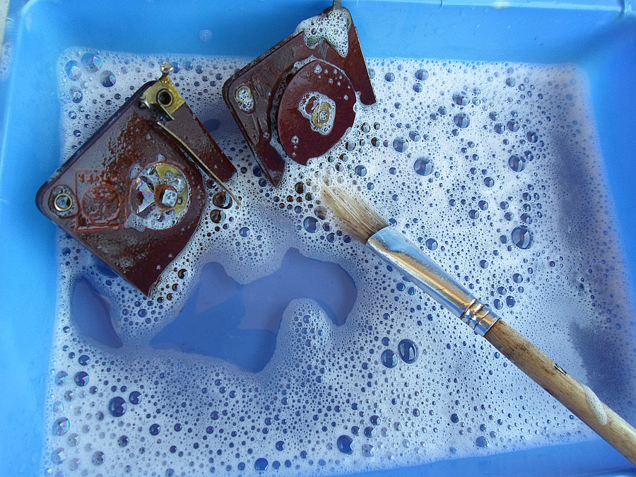 jetzt habe ich Stückchen weiter mit die Arbeit. Neulich habe ich eine Chassis gekauft. Da haben viele Teile gefehlt: Ich wollte das erstmal ausschlachten, aber später anders überlegt. Und wie immer das Dings kämm in die Badewanne und dann auf mein Tisch. Jetzt seiet das so aus: