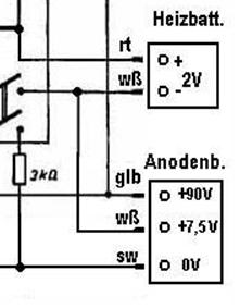 Eine zweite Möglichkeit ist, die Anoden- und Heizbatterie , extern an -2 V ws und +7,5V ws zu verbinden und nur 1x ws im Gerät, am Schalter, anzuschließen.