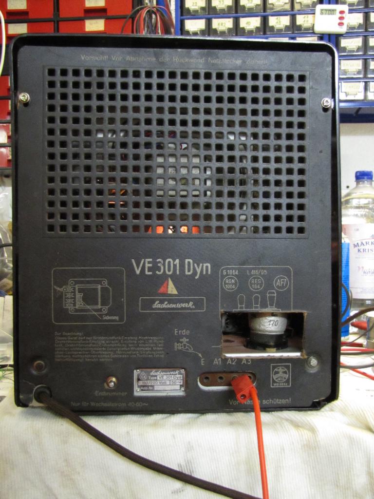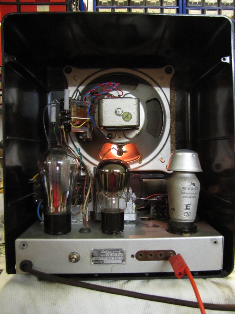 nun funktioniert mein Chassis erstmal. Als Ausgangstrafo habe ich momentan einen für die EL95 optimierten genutzt, der offensichtlich das genau gleiche Übersetzungsverhältnis hat wie das Original und der zufällig genau die gleichen mechanischen Abmessungen (Schraubenabstand) besitzt. Ich habe die vorhandenen 8µF Elkos aus den 50-er Jahren gegen 4µF Typen (regeneriert in Originalgehäuse mit Originaldruck) aus der E-Bucht getauscht. Dann habe ich den Mehrfachkondensator ausgewechselt (0,2µF / 0,1µF / 0,1µF), da mindestens der 0,2µF nur noch knapp 20nF hatte. Jetzt sind erstmal neue drin, den alten hebe ich auf (ist ggf. neu befüllbar). Den Koppel-C von der Anode der AF7 zum Gitter der Endröhre hatte ich zunächst belassen. Er war statisch (bei 3V) hochohmig und seine Kapazität war mit 13nF (statt 10nF) auch ok. Dann steckte ich nur die Gleichrichterröhre. Es waren 450V Anodenspannung im Leerlauf vorhanden und am Gitter der (nicht gesteckten) Endröhre lagen +95V an. Also war auch der Koppelkondensator fällig. Im Betrieb soll zwar an der Anode der AF7 nur 17V ... 33V sein, aber beim Hochheizen könnte ja die Anodenspannung vor dem Strom der AF7 oben sein und dann hätte das Gitter der Endröhre hohes positives Potential. Nach dem Wechsel des Kondensators war die Spannung am Endröhrengitter negativ, also durfte nun die Endröhre rein. Es brummte im Lautsprecher und wenn der Anodenanschluss der (nicht gesteckten) AF7 berührt wurde, brummte es lauter. Nun kam die AF7 hinein und das Gerät konnte mit einem einige Meter langen Kabel im Keller einige Mittelwellensender (DLF, 2 x russ. 1 x frz.) sowie einen Langwellensender empfangen. Das Brummen war mir jedoch zu stark und ich baute einen zusätzlichen Elko von 4µF vom Pluspol des Ladeelkos zur Masse des Gerätes ein. Das verringert das Brummen erheblich. Es ist zwar nun modifiziert, aber auf eine Art, die auch zur Hauptnutzungszeit hätte gemacht sein können (hätte ich bestimmt so gemacht!). Nun konnte auch mit dem nachgerüsteten Entbrummregler (50 Ohm genau passendes Drahtpoti, das ich gerade da hatte - als Ersatz für die beiden in diesem Gerät bestückten 25 Ohm Widerstände) auf Brummminimum abgeglichen werden.
