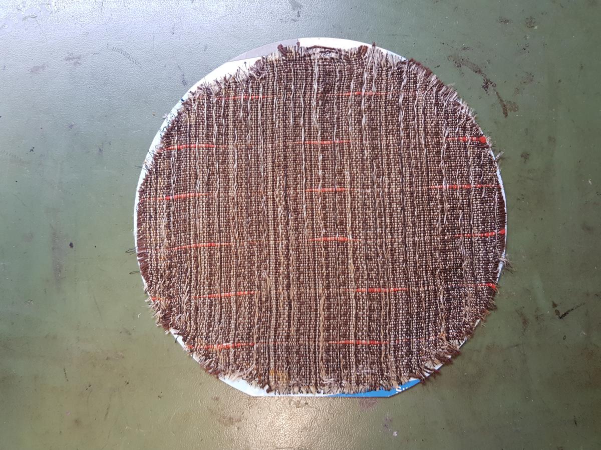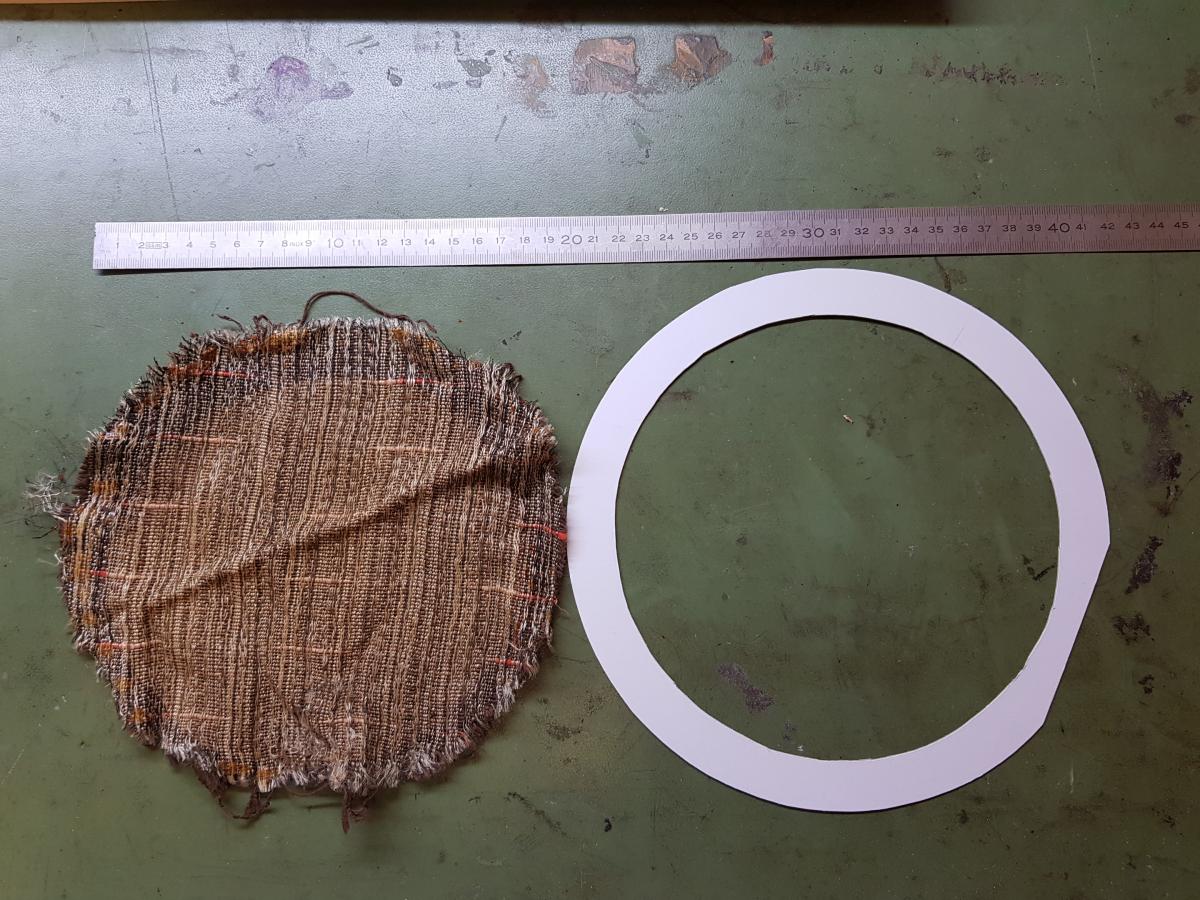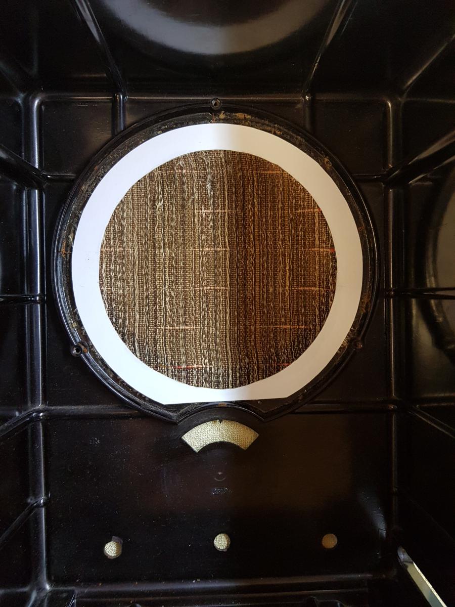 Die letzte Baustelle war dann noch die Lautsprecherabdeckung. Der originale Stoff lag glücklicherweise noch im Gehäuse drin, also habe ich mich noch dran gemacht, den "neuen" Stoff wieder zu ersetzten. Da der originale Stoff recht knapp ist, habe ich ihn erst auf einen Ring aus Pappe geklebt, um ihn zu spannen und in Form zu bringen. Den Ring sieht man später nicht mehr, da der Lautsprecher davor ist. Schöner wäre es natürlich ohne Pappring gewesen, aber ich hatte etwas Bedenken, ds kleine Stoffstück im Gehäuse gerade reinzufummeln.