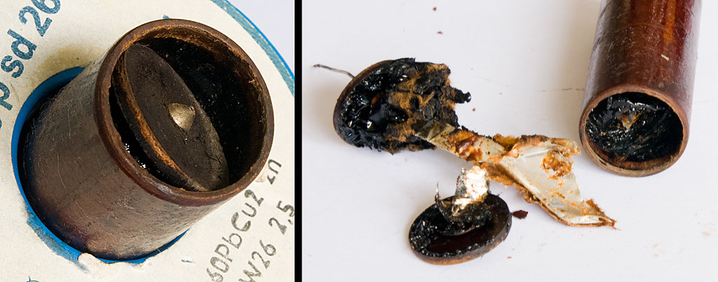 Hallo Jürgen, danke für den Tipp. Bin so vorgegangen, die Kappe ließ sich irgendwann einseitig eindrucken (siehe Bild) und dann entfernen. Der Duft, der mir dann entgegenströmte, war herzallerliebst. Bei mir fand ich eine schwarze, klebrige Masse drin (Teer?). Die Hülse gereinigt, die vorgefertigten Kondensatoren dann eingebaut, alles mit Heißkleber aufgefüllt bzw. fixiert, die Deckel wieder drauf. Sieht alles wunderbar aus, nur habe ich *** beizeiten vergessen, die Polarität der Kondensatoren zu markieren... Nun habe ich einen wunderbar restaurierten Kondensator, den ich aber wieder zerlegen darf. Tolle Wurst, ich könnte mich... Viele Grüße Olaf